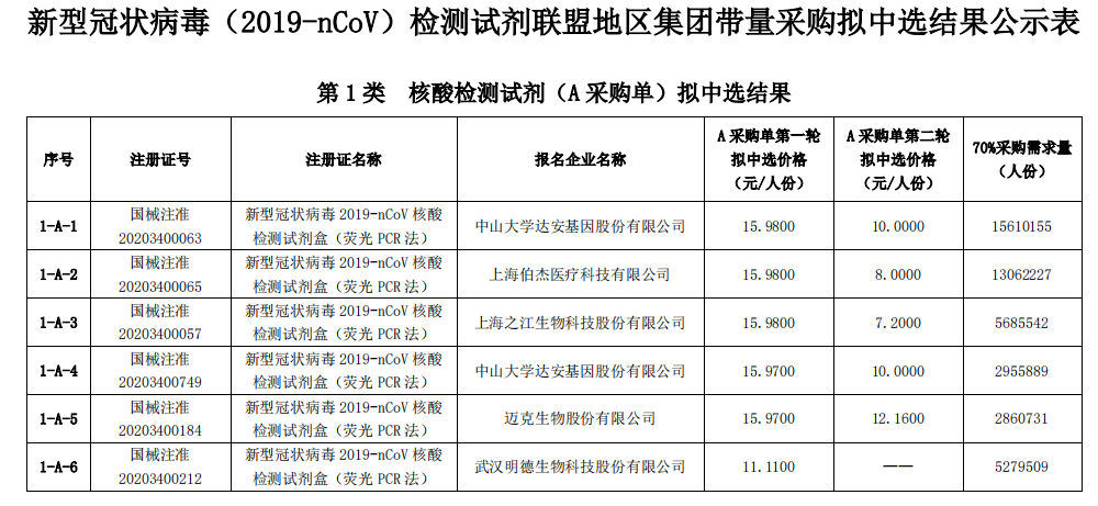 因为,我国检测方法主要为核酸检测,因此我们重点关注被分在第一类的核酸检测试剂。根据公布的报名信息,本次新型冠状病毒(2019-nCoV)检测试剂联盟地区集团带量采购合格申报产品第一类核酸检测试剂共22个注册产品。根据规则,这些产品中采购量进入联盟地区预采购量前90%的将会进入A采购单,A采购单采用两轮竞价,第一轮为限定报价,只要不超过限定价,都会中选;第二轮淘汰价格降幅最小的1个申报产品,从目前公布的预中选结果开看,武汉明德生物因降幅最低而第二轮被淘汰。详细中标结果见下图: