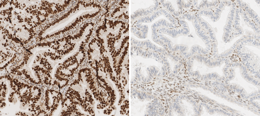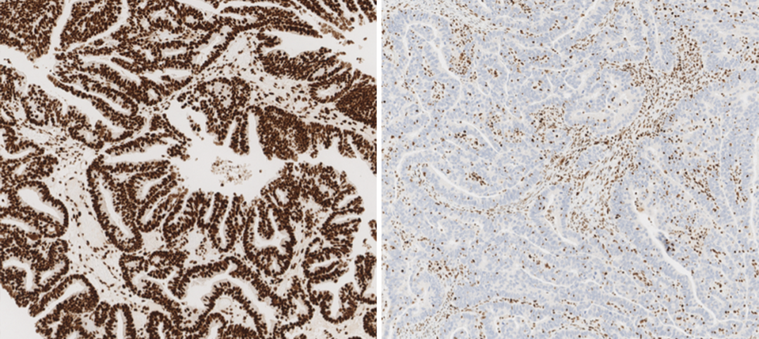 Figure 1: VENTANA anti-MLH1 (M1) Mouse Monoclonal Primary Antibody staining with Intact (left) or Loss (right) of expression in the presence of evaluable internal controls in endometrial carcinoma tissue. Figure 2: VENTANA anti-MSH6 (SP93) Rabbit Monoclonal Primary Antibody staining with Intact (left) or Loss (right) of expression in the presence of evaluable internal controls in endometrial carcinoma tissue. Figure 3: VENTANA anti-MSH2 (G219-1129) Mouse Monoclonal Primary Antibody staining with Intact (left) or Loss (right) of expression in the presence of evaluable internal controls in endometrial carcinoma tissue. Figure 4: VENTANA anti-PMS2 (A16-4) Rabbit Monoclonal Primary Antibody staining with Intact (left) or Loss (right) of expression in the presence of evaluable internal controls in endometrial carcinoma tissue. References:FDA官网,Roche官网 -END- |