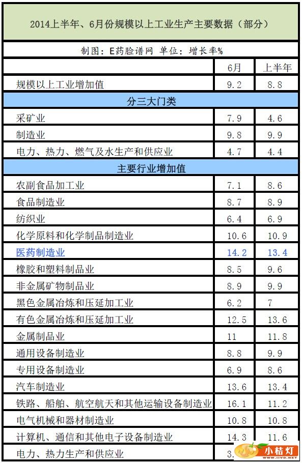 7月16日,国家统计局通过官网发布信息:2014年上半年,中国国内生产总值(GDP)同比增长7.4%。多方分析认为,中国经济于二季度止跌和稳增长措施的推出直接相关,随着政策效力减弱,三季度开始,经济下行压力可能再次增大。确保全年增长目标的实现,需要微刺激和改革同行,进一步释放市场活力,而不是扩大刺激规模,否则很可能产生金融挤出效应伤害实体经济运行。 另一方面,国家统计局发布2014年上半年规模以上工业增加值和6月份规模以上工业增速。据显示,上半年规模以上工业增速同比增长8.8%;6月份规模以上工业增加值同比实际增长9.2%。(注:国家对不同行业的企业都制订了一个规模要求,达到规模要求的企业就称为规模以上企业,工业同理。)医药制造业在所有行业中增长迅速,上半年同比增长13.4%,6月份同比增长14.2%。