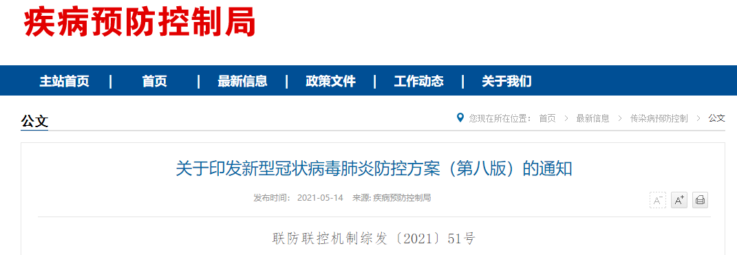 各省、自治区、直辖市及新疆生产建设兵团应对新型冠状病毒肺炎疫情联防联控机制(领导小组、指挥部),中国疾控中心:为进一步指导各地做好新型冠状病毒肺炎防控工作,国务院应对新型冠状病毒肺炎疫情联防联控机制综合组制定了新型冠状病毒肺炎防控方案(第八版)。现印发给你们,请认真组织实施。各地在执行过程中如有相关建议,请及时反馈机制综合组。