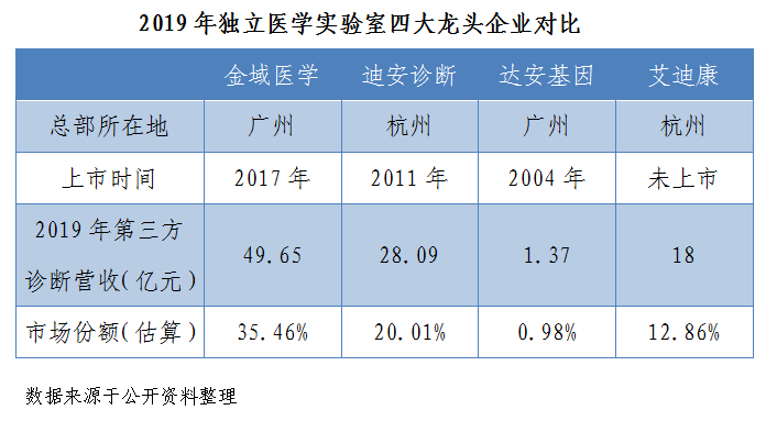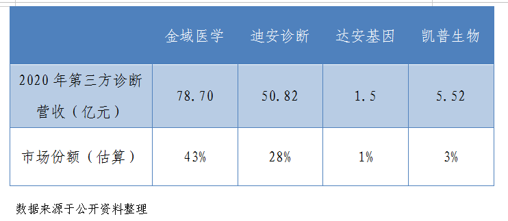 独立医学实验室(ICL)近些年发展迅速,已成为IVD下游需求的主要消费渠道之一。但相较于国外市场,我国独立医学实验室起步晚了半个多世纪。上世纪80年代,我国出现了一些早期的检测服务中心,直到21世纪初,广州金域医学检验中心成为我国第一个被卫生行政部门批准的的独立医学实验室。随后艾迪康、达安等独立医学实验室相继成立并开始全国连锁的经营模式。 2013年之前,全国仅有50家左右的独立医学实验室,2013年-2018年,独立医学实验室数量呈爆发式增长,2018年达到了1500家左右。 受人口密度、经济发展、医疗资源等因素影响,独立医学实验室主要集中在东部沿海及一线城市,西部等欠发达地区的独立医学实验室数量小,且规模一般较小。 金域医学、迪安诊断、达安基因、艾迪康是独立医学实验室四大龙头企业,2019年合计约占70%的市场份额,布局以省级城市为主,总数超过90家。市场份额最大的金域医学,收入规模在50亿元左右。2019年,我国独立医学实验室行业市场规模约为150亿元,总体上行业仍处于起步阶段。 在百年不遇的新冠疫情狙击之下,提前完成全国省级实验室布局的金域医学、迪安诊断发挥了支撑作用并做出了重大贡献,基本确立了国内金域和迪安双寡头竞争格局,二者合计约占70%的市场份额。而达安基因2020年第三方检测服务收入约为1.5亿元,业绩暴增主要得益于新冠病毒核酸检测试剂盒、核酸检测仪器与相关耗材的需求量大幅增长,与第三方检测业务关系不大。凯普生物后来居上,2020年第三方检测服务实现收入 5.52 亿元。 2020年,依托省级实验室网络,金域医学先后在湖北、广东、吉林、北京等 30 个省市区和香港、澳门开展核酸检测,截至2020年末,核酸累计检测超过3200 万人份,全年营收达 82.44 亿元,其中第三方检测服务收入达到78.70亿元。37家实验室中,已有29家实现盈利。 迪安诊断1996年成立之初主营业务是体外诊断产品代理,2004 年将公司战略定位于 ICL 领域,2017年完成全国 38 家综合实验室的布局,此后,公司将重心逐步向发展特检业务倾斜,目前34家实验室已经实现盈利。公司特检技术平台包括质谱、NGS、血液病等多个平台,可以检测 2500 个左右的检测项目。 2020年新冠疫情爆发,根据公司披露数据,迪安诊断承担了国内几乎 1/10 的新冠检测量。2020年营收106.49亿元,同比增长25.98%,归母净利润8.03亿元,其中实验室诊断服务实现收入50.82亿元,同比增长61.99%。 达安基因披露,公司新冠核酸检测试剂日均产能达30万至50万人份/日,根据市场需求产能可以达到100万人份/日以上。2020年全年新冠核酸检测试剂出仓量约1.5亿人份。2020 年营收 53.41亿元,其中新冠病毒核酸检测试剂盒销售收入29.75亿元,业绩增长主要得益于新冠病毒核酸检测试剂盒、核酸检测仪器与相关耗材的需求量大幅增长,与检测业务关系不大。 凯普生物2020年营收13.54亿元,同比增长85.70%,归母净利润3.63亿元。医学检验服务实现收入5.52亿元,同比增长560.00%,毛利率大幅提升至67.78%。2020年18家医学实验室医学实验室总计完成新冠核酸检测超 500万人次,贡献收入超过4亿元,均实现扭亏为盈。同时还有20余家第三方独立医学实验室正在规划建设中,未来将建成全国实验室运营网络。 华大基因2020全年收入84亿元,同比增长199.9%,归母净利润20.9亿元。其中感染防控收入6.7亿元,同比增长724.22%,主要受益于新冠检测的贡献。截至2020年末,公司在国内多个主要城市落地“火眼”实验室,累计在海外运营“火眼”实验室超过80个,分布在全球近30个国家及地区。 2020 年 2 月 12 日国家卫生健康委办公厅下发了《关于医疗机构开展新型冠状病毒核酸检测有关要求的通知》,提出各省可以购买服务的方式,与具备条件的第三方检测机构合作开展检测。迪安诊断、金域医学、凯普生物等公司均在各地防疫中承担大量工作,为快速大幅提升检测能力,华大基因通过5天时间的高效施工建成日检测能力达万人份的武汉“火眼”实验室,并复制到全国多地以及海外。第三方独立医学实验室成为 CDC 的有力补充,获得更多认可。 2021 年 3 月,国家药监局正式发布了最新修订的《医疗器械监督管理条例》。其中第 53条规定“对国内尚无同品种产品上市的体外诊断试剂,符合条件的医疗机构根据本单位的临床需要,可以自行研制,在执业医师的指导下在本单位内使用。具体管理办法由国务院药品监督管理部门会同国务院卫生主管部门制定。” 行业普遍认为该条例的修订为监管机构对 LDT 的放宽,对于一些以第三方检测为主要商业模式的企业为重大利好。