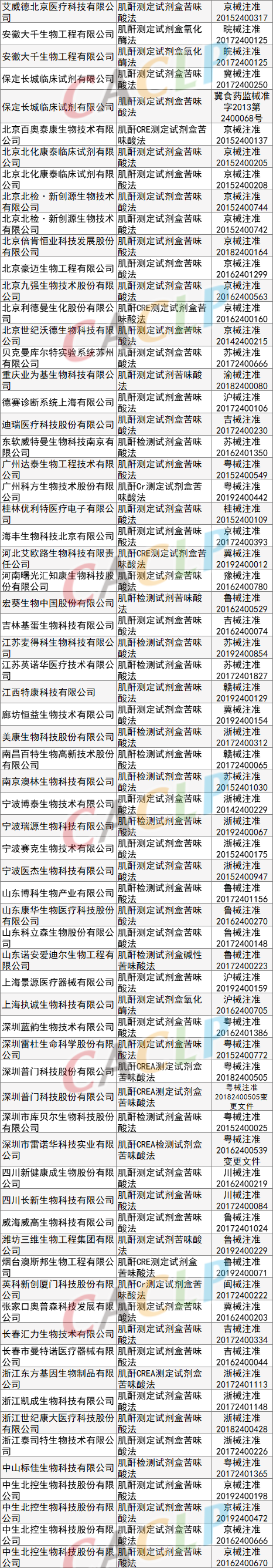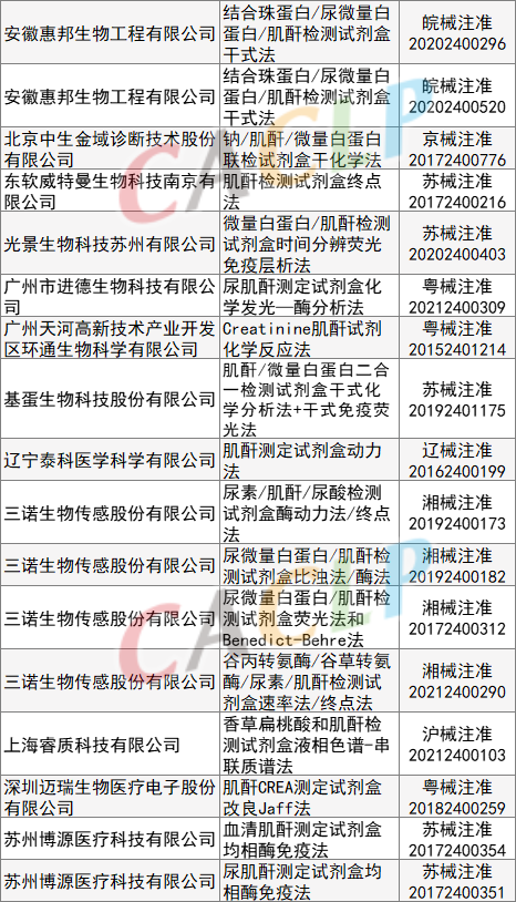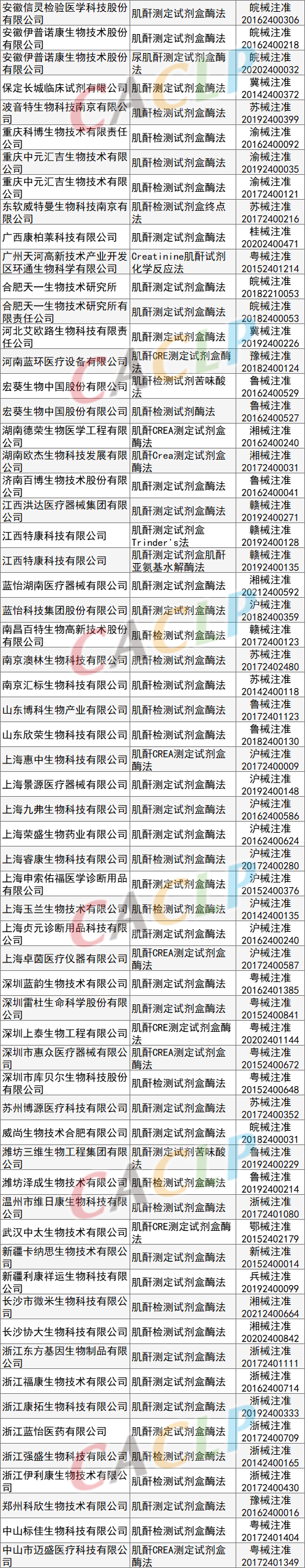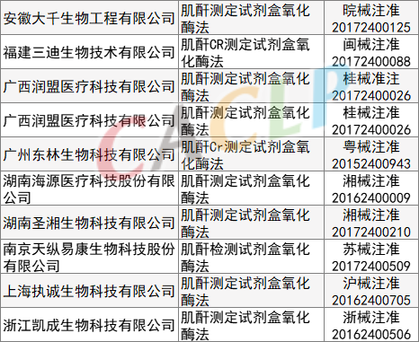 一般而言,硬化、坏死的肾小球是不可逆的,肾小球坏死一批少一批。所以,慢性肾衰竭也是不可逆的,逐渐升高的血肌酐也是不可能降到正常的。但是,医生还要积极治疗。积极治疗的目的并不是将血肌酐恢复到正常,而是保护剩余的肾小球不再被破坏。换句话说,积极治疗的目的是避免血肌酐进一步升高。 根据载玻片APP及NMPA数据显示,目前有287项获证的肌酐测定试剂盒的产品,这些产品分别使用了酶法、苦味酸法、荧光免疫层析法、串联质谱法等方法学,小编分类整理供大家参考。 酶法 肌氨酸氧化酶法 苦味酸法 氧化酶法 其他 参考资料出处:海军军医大学第三附属医院肾内科、肾上线、北京积水潭医院、医学之声 -END- |
