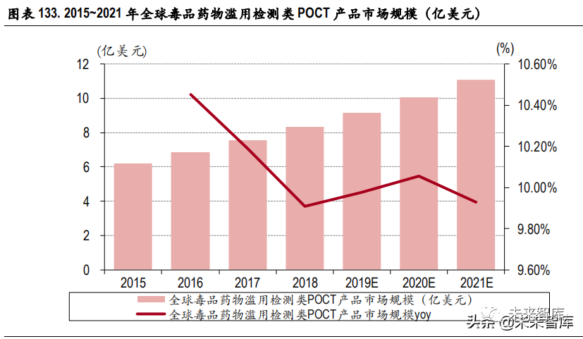 近年来,全球毒品药物滥用类 POCT 产品市场规模一直保持稳定增长的趋势,从 2015 年的 6.22 亿美 元增长到 2018 年的 8.32 亿美元,预计 2021 年全球毒品及药物滥用 POCT 产品的需求量达 11.07 亿美 元 6。随着世界毒品市场的扩大以及各种新型毒品的不断出现,吸毒成本降低,吸毒人数逐年增长, 未来全球将会加大对毒品药物滥用的监控和打击力度,会极大的带动毒品及药物滥用监控检测 POCT 产品的市场需求,毒品及药物滥用监控检测 POCT 产品的市场发展潜力巨大。