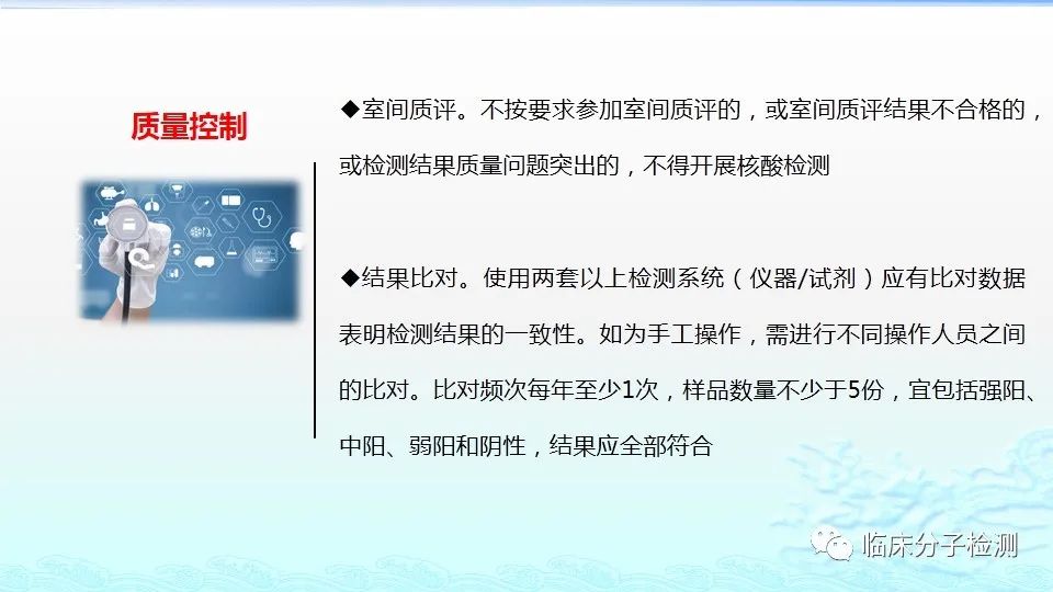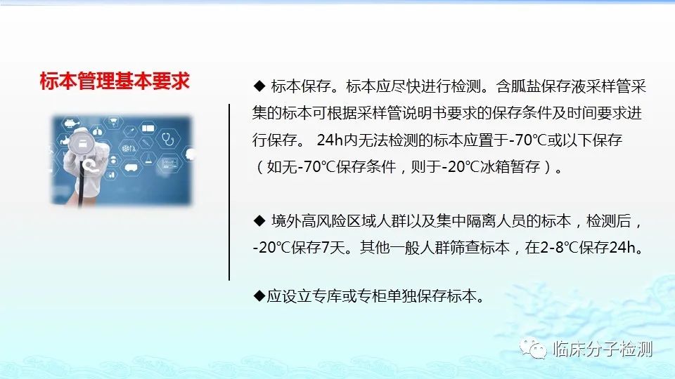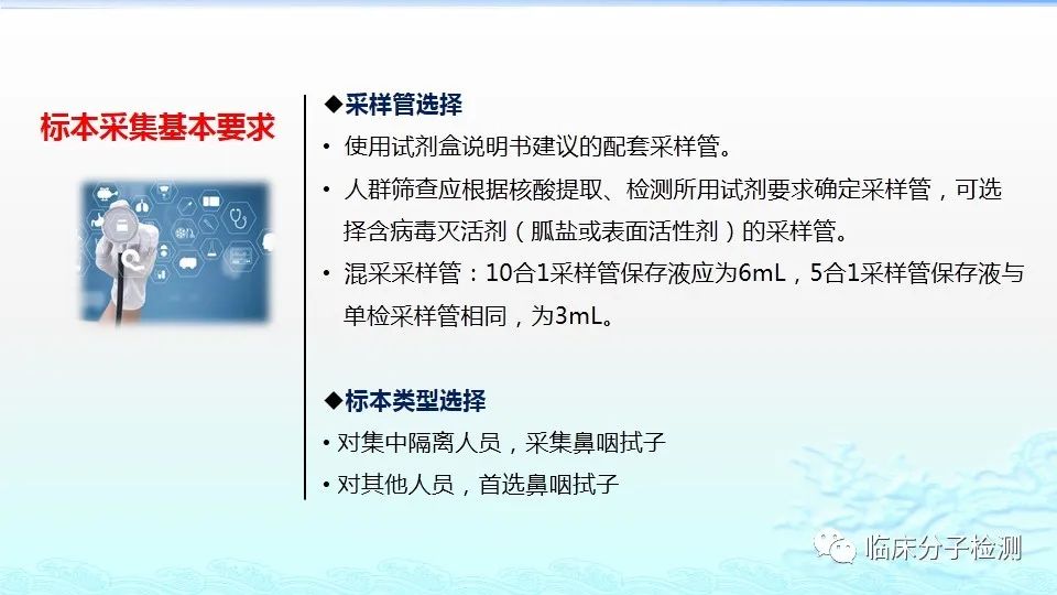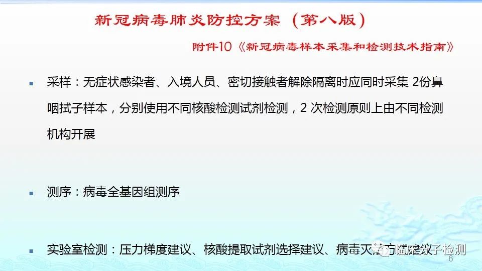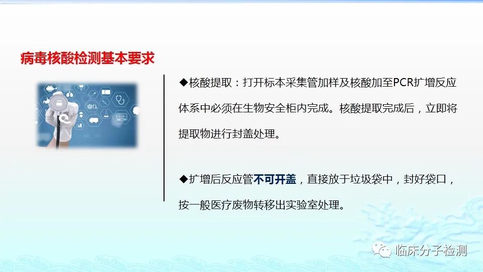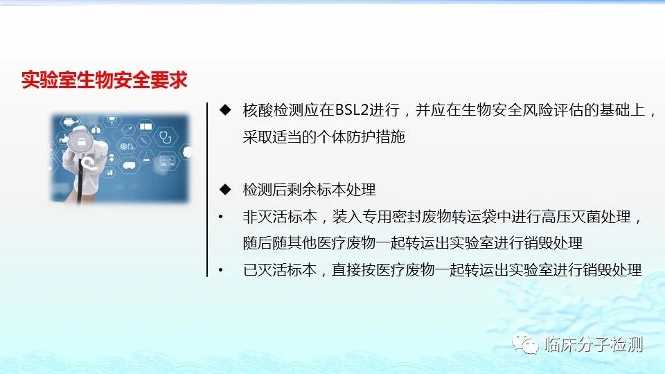 6月22日,在上海市医疗机构新冠病毒核酸检测质量管理专题培训会上,上海市临床检验中心分子室的肖艳群主任为大家做了《新冠病毒肺炎防控方案(第八版)解读及新冠病毒核酸检测常见问题分析及解决方案》的专题报告,重点结合《新型冠状病毒肺炎防控方案(第八版)》及其“附件10《新冠病毒样本采集和检测技术指南》”中内容给大家做了解读,特别是针对新版文件中所提出的新要求,如无症状感染者、入境人员、密切接触者的采样要求、病毒基因测序、实验室检测(如压力梯度建议、核酸提取试剂选择建议、病毒灭活方式建议等)要求等做了详细说明。此外,肖老师还对新冠病毒核酸检测常见问题分析及解决方案做了详细介绍。 |