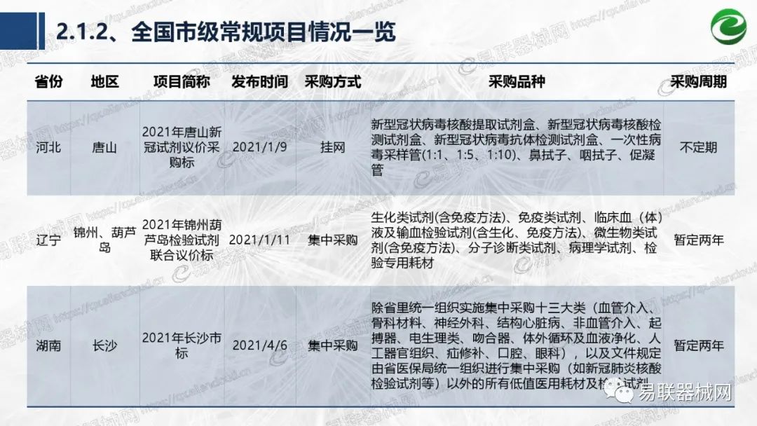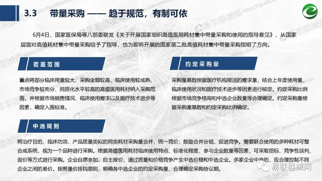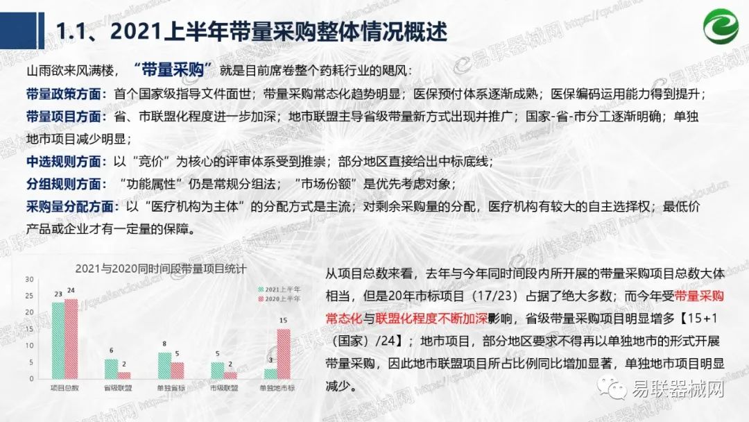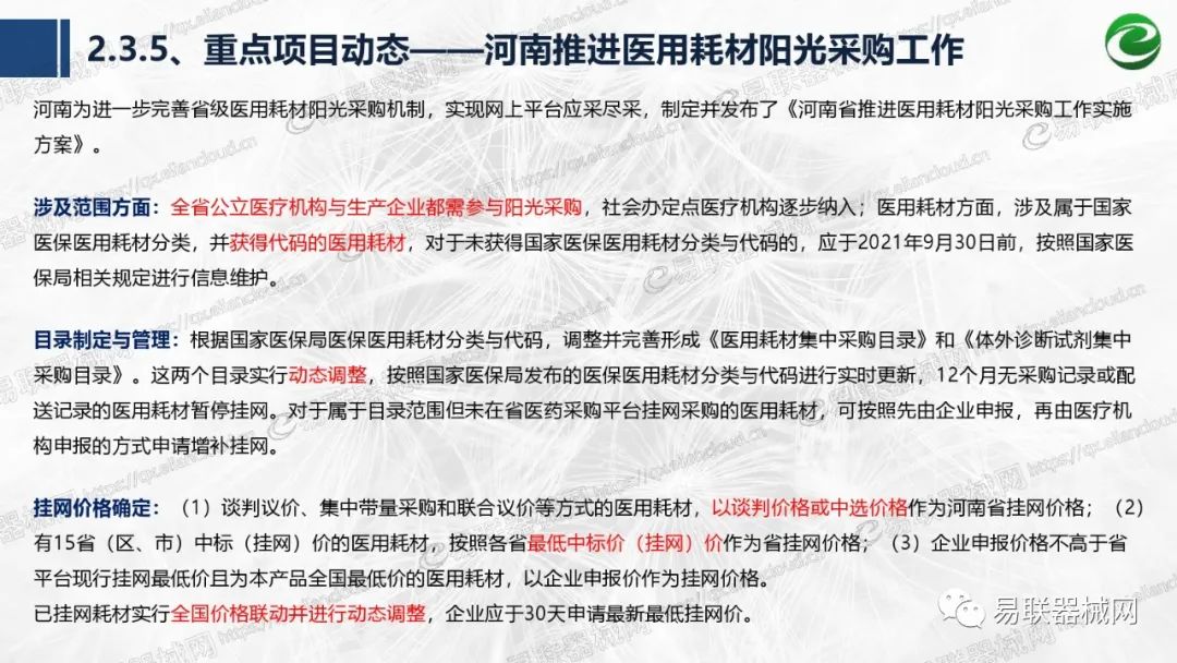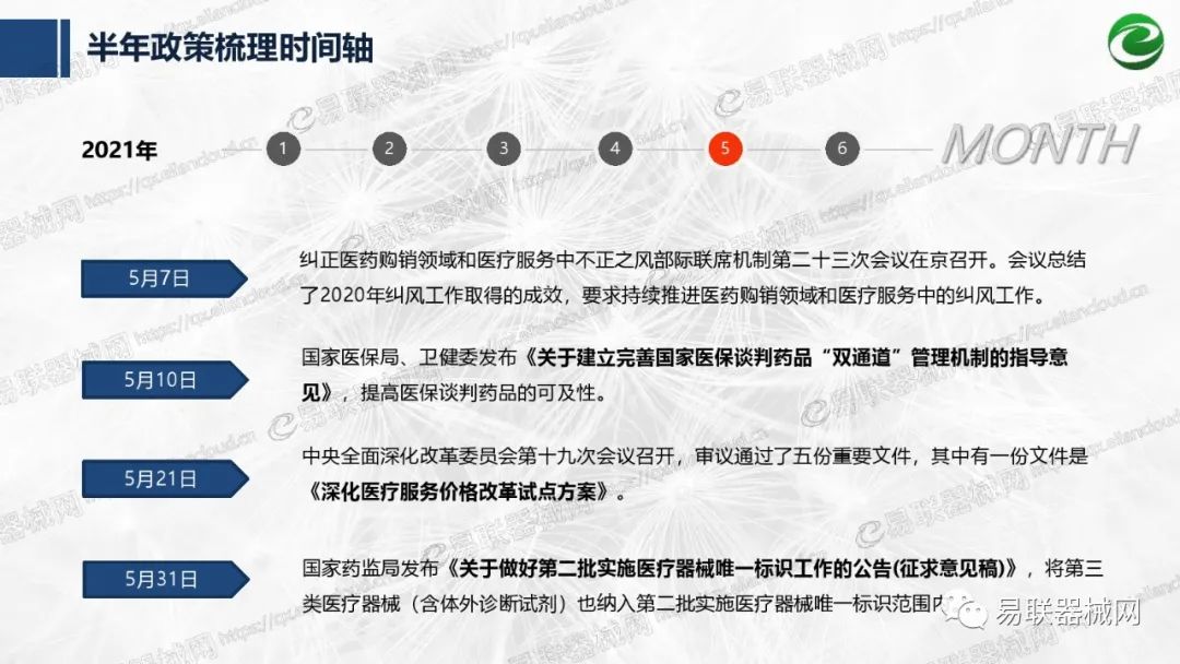 带量采购方面:2021年上半年,带量采购持续发力,仍是行业内的焦点所在。首批带量采购项目即将届满,相应续标工作有序展开;带量采购常态化、规范化文件相继出台,引领耗材带量采购走向新的篇章…… 常规项目方面:各地挂网工作有序开展,新老平台切换稳步推进;地方工作上:北京耗材限价挂网、内蒙古简化挂网流程、四川与江西规范并完善药耗集采工作、河南持续推进阳光挂网、海南实行“红黄绿”价格预警…… 政策方面:八部委联合印发带量采购规范文件,指导高值医用耗材集中带量采购;信用评价制度建立,严厉打击医疗行业不正当利益关系;医疗服务价格改革试点方案发布,建立合理补偿机制,稳定调价预期;医疗器械唯一标识第二批实施工作即将开展;《医疗器械监督管理条例》修订发布,旨在保障医疗器械安全、推动行业健康发展…… |