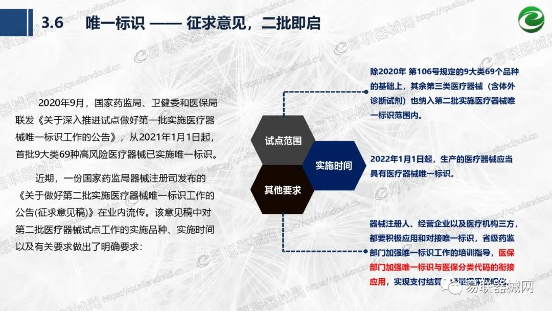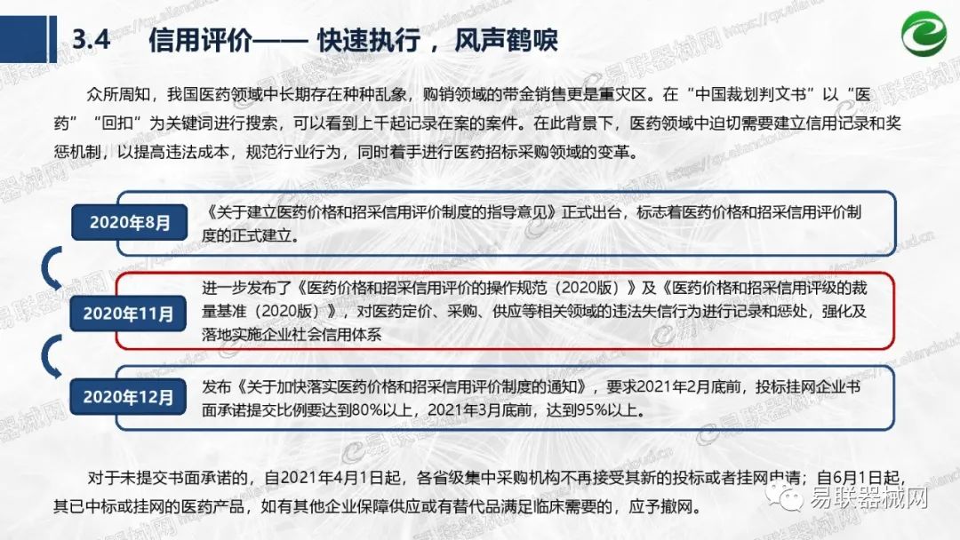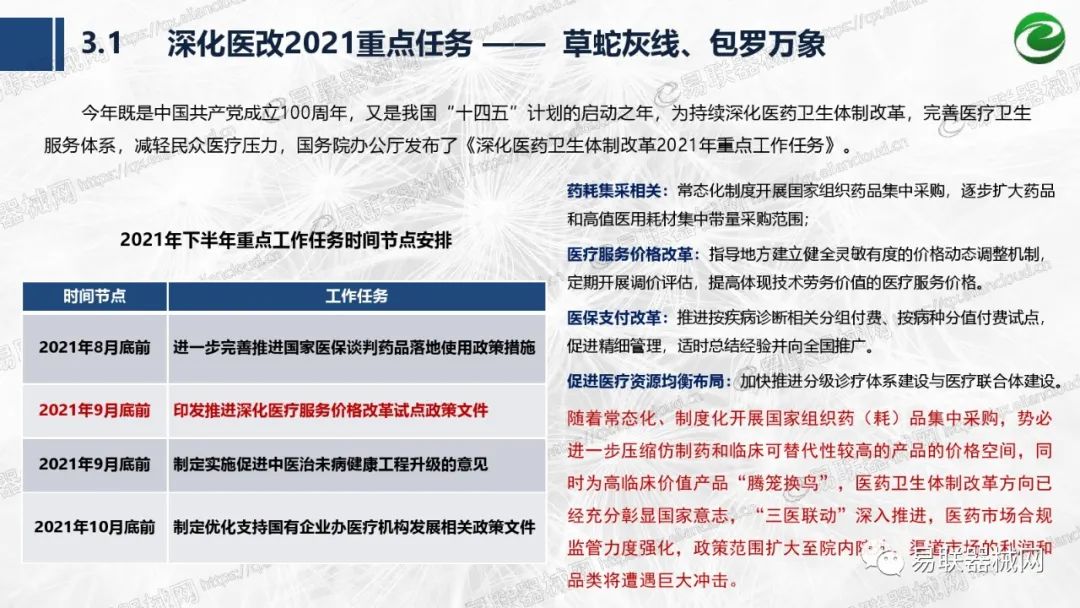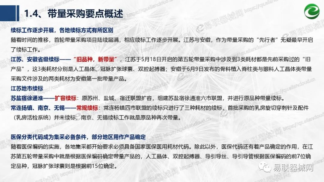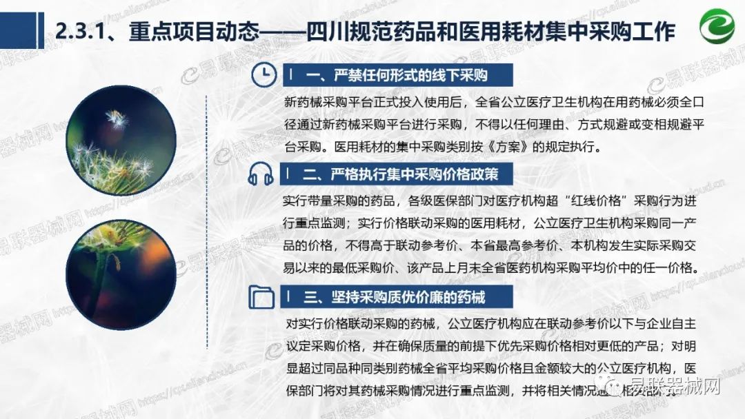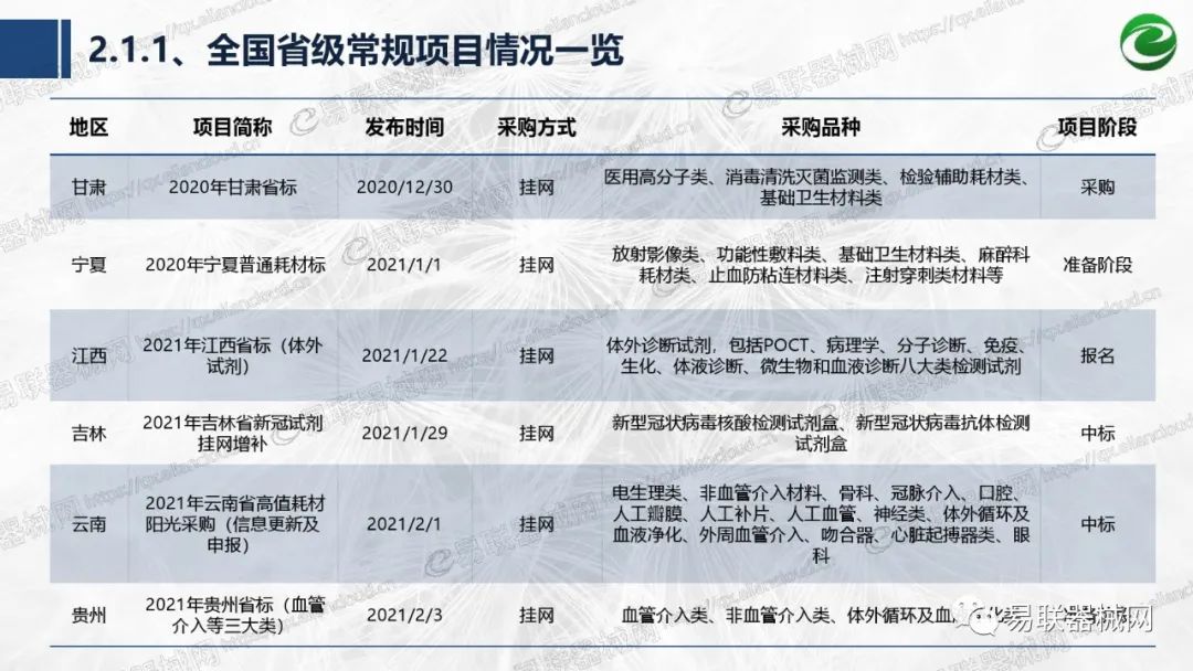 带量采购方面:2021年上半年,带量采购持续发力,仍是行业内的焦点所在。首批带量采购项目即将届满,相应续标工作有序展开;带量采购常态化、规范化文件相继出台,引领耗材带量采购走向新的篇章…… 常规项目方面:各地挂网工作有序开展,新老平台切换稳步推进;地方工作上:北京耗材限价挂网、内蒙古简化挂网流程、四川与江西规范并完善药耗集采工作、河南持续推进阳光挂网、海南实行“红黄绿”价格预警…… 政策方面:八部委联合印发带量采购规范文件,指导高值医用耗材集中带量采购;信用评价制度建立,严厉打击医疗行业不正当利益关系;医疗服务价格改革试点方案发布,建立合理补偿机制,稳定调价预期;医疗器械唯一标识第二批实施工作即将开展;《医疗器械监督管理条例》修订发布,旨在保障医疗器械安全、推动行业健康发展…… |