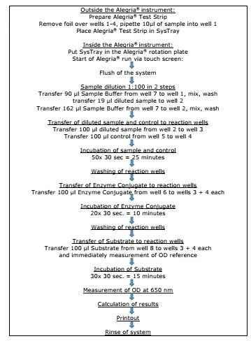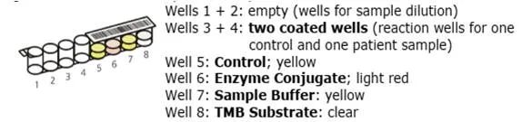Alegria平台创新性的解决了ELISA检测试剂需要积累样本集中检测的问题,即使每天1-2个样本也可以用ELISA方法提供定量检测结果。Alegria平台配套的试剂采用的是8联排的微孔条,Well 1和2是用于样本加载及稀释,Well 3和4是包被抗原的微孔,用于患者样本及质控反应,Well 5预装了阳性质控,Well 6预装了酶标二抗,Well 7预装了样本稀释液,Well 8预装了底物液。