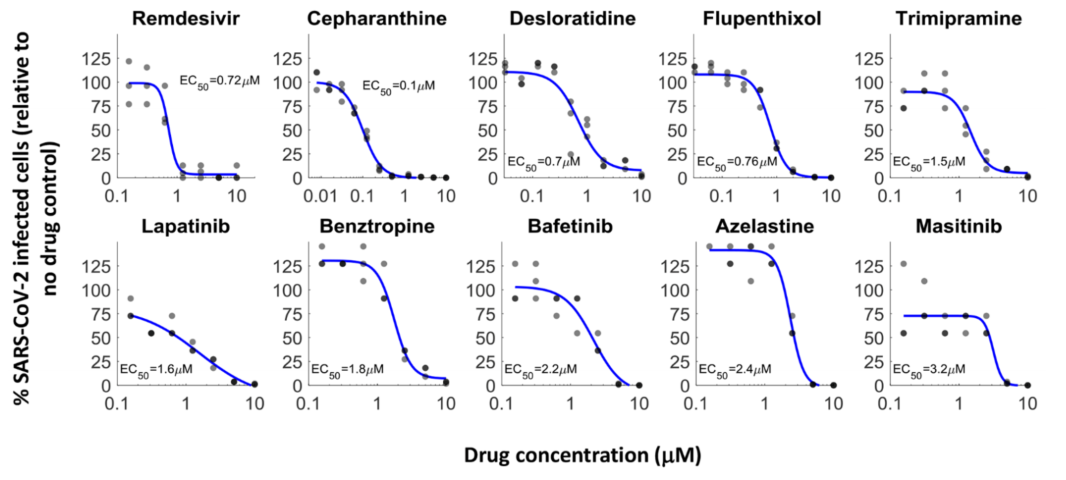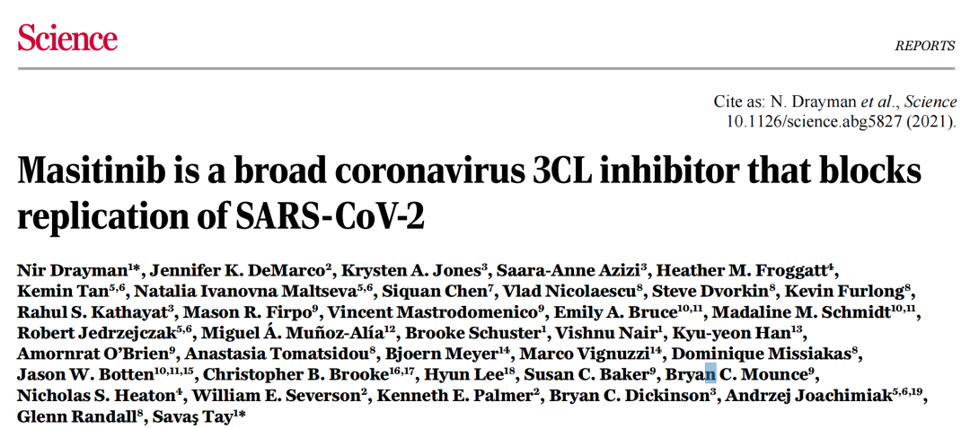 尽管新冠疫苗正在全世界广泛接种,有效遏制了新感染人数不断上升的趋势,但同时也面临着病毒变异导至疫苗保护效果下降的问题,在短期内,新冠病毒还将持续威胁着我们的健康。 除了疫苗这个有效对抗病毒的武器之外,科学家也一直在寻找能够抑制病毒复制的药物,而芝加哥大学的研究人员最近就发现了一种药物能够高效抑制新冠病毒的复制:马赛替尼,相关成果已发表于本周的Science杂志。 新冠病毒基因组包含有三万多个碱基,编码了约30个蛋白,其中16个蛋白以2条多蛋白(多个蛋白连接在一起)的形式存在,需要病毒自身携带的蛋白酶3CLpro将这些多蛋白分解为单个蛋白,才能发挥这些蛋白的功能,进而完成病毒的复制周期。这个蛋白酶在多种冠状病毒中均存在,而且对于病毒的复制起着关键作用,是一个开发抗病毒药物的好靶点。 芝加哥大学的研究团队使用了同属冠状病毒但毒力很低,仅会造成普通感冒的OC43冠状病毒来进行药物筛选,共筛选了1900种目前临床使用的或正在进行临床实验的,安全性较好的药物。筛选实验重复了两次(筛选流程见图1),发现了108种药物能够降低OC43的感染能力,研究者选取了效果最好的一些药物,包括瑞德西韦、两性霉素B、艾尔巴韦、马赛替尼、巴非替尼、测定了其EC50(半数抑制浓度),这些药物对OC43的EC50在0.17-7μM之间。 图1. 药物筛选流程 图2.对OE43冠状病毒效果最好的一些药物的EC50测定 随后,研究者又用相同的实验方法,测定了这些药物对新冠病毒的抑制能力(图3),结果显示,对OC43抑制最强的艾尔巴韦和两性霉素B,对新冠病毒没有抑制效果;而瑞德西韦和马赛替尼等20个药物,显示了较好的抑制新冠病毒的活性。 图3. 候选药物对SARS-CoV-2的EC50测定。