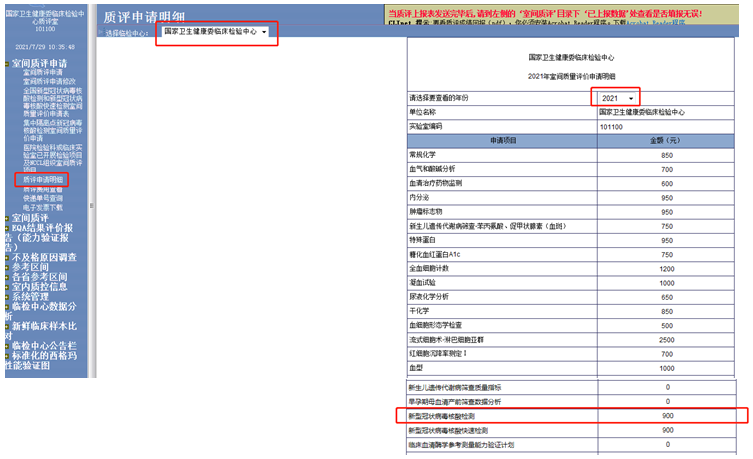 鉴于新型冠状病毒德尔塔变异株引起广州、瑞丽、南京等地疫情,近期全国部分省市也出现一些南京疫情相关病例,为了解全国各新型冠状病毒核酸检测实验室对德尔塔变异株的检测质量,保证新冠病毒核酸检测在疫情防控中的有效性,国家卫生健康委临床检验中心特应急开展2021年全国新型冠状病毒德尔塔变异株核酸检测室间质量评价,本次质评免费。现将有关事项通知如下。1.已经报名参加2021年度全国新型冠状病毒核酸检测室间质量评价的实验室共计3656家。上述3656家实验室本次无需再次报名,直接纳入本次室间质评。活动结束后发放预期结果、质评小结和成绩单,本次成绩作为计算全年室间质评合格的依据之一,2021年底发放室间质评证书。实验室可登录国家卫生健康委临床检验中心官网(https://www.nccl.org.cn/mainCn)—EQA客户端—左侧树状栏室间质评申请—质评申请明细—选择年份“2021”查询,是否为已报名实验室,无需电话询问。查询下方附件1。附件1. 已经报名参加2021年度全国新型冠状病毒核酸检测室间质量评价的实验室:查询界面。2. 未报名参加2021年度全国新型冠状病毒核酸检测室间质量评价的实验室:(4)活动结束后,发放预期结果和质评小结,供实验室改进质量参考。不发放成绩单和证书。样本预计8月中旬邮寄,邮寄前3天短信通知质控品接收人。样本收到后即测。本次室间质评活动中的样本邮寄相关问题可与室间质评室联系:- 联系电话:(010)58115055,58115065