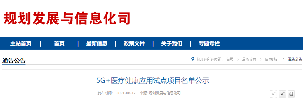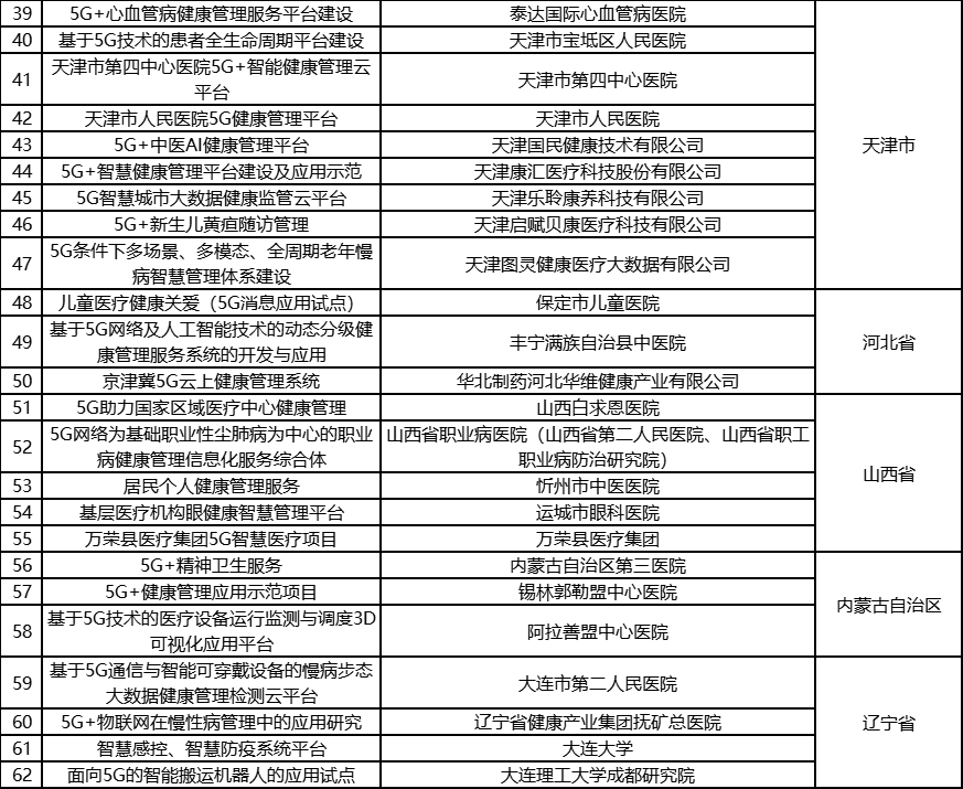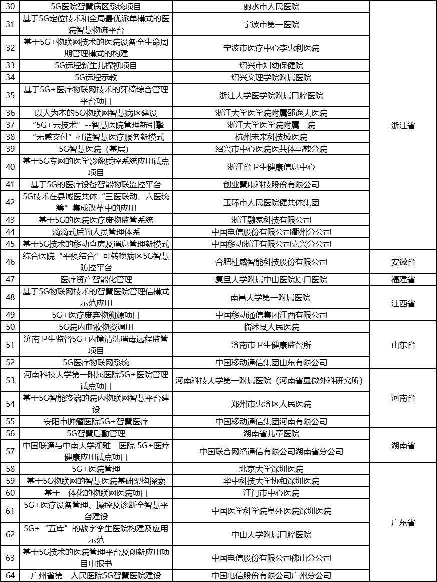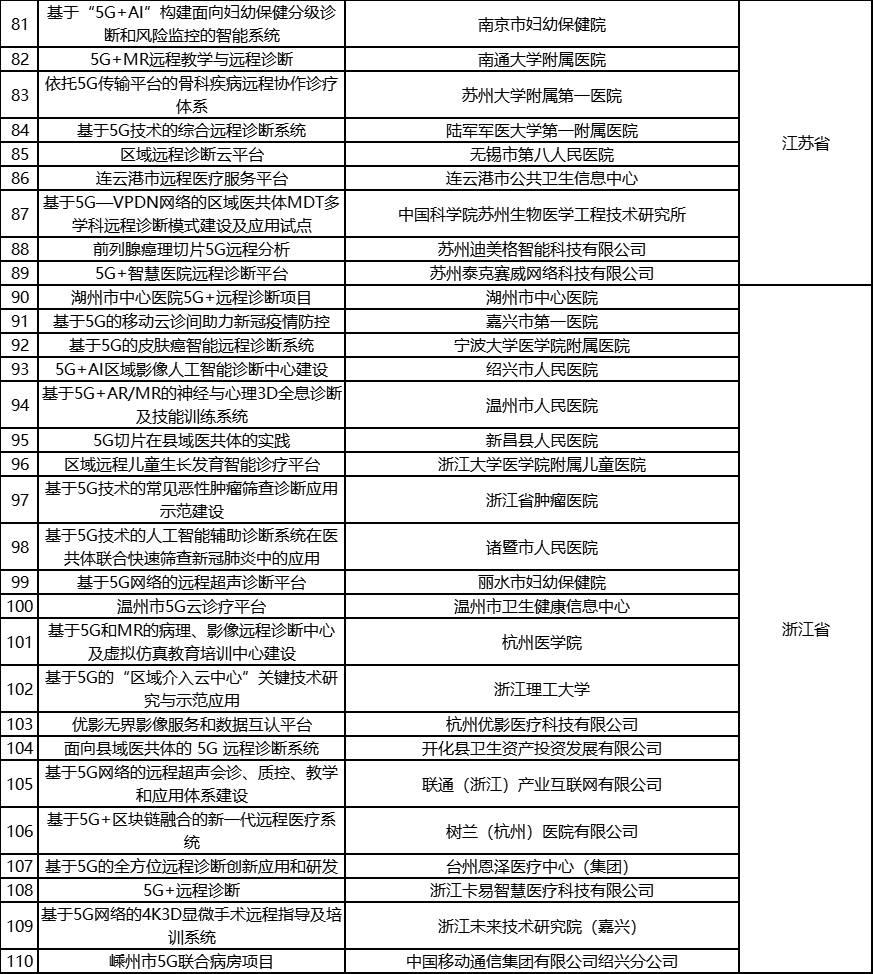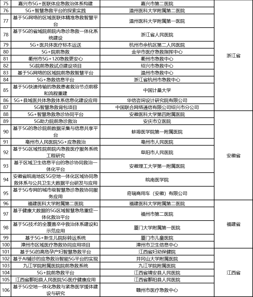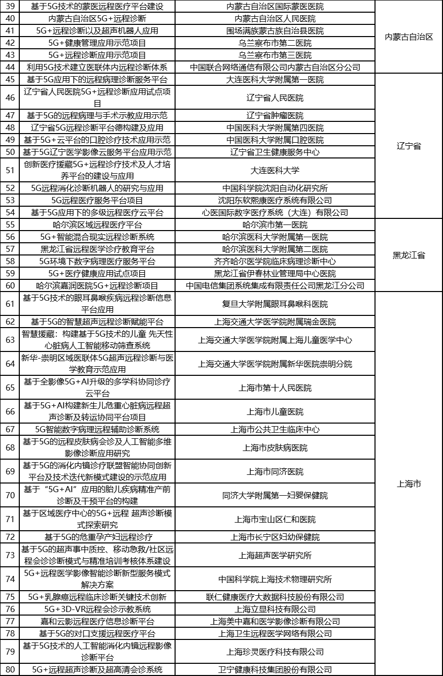 根据《工业和信息化部办公厅国家卫生健康委员会办公厅关于组织开展5G+医疗健康应用试点项目申报工作的通知》(工信厅联通信函〔2020〕270号)有关要求,按照“宽进严出,优中选优”的整体工作思路,经项目申报、专家初审、复审等程序,现将5G+医疗健康应用试点项目名单予以公示。 如有异议,请以书面形式反馈。公示时间:2021年8月17日至8月23日。 联系单位: (一)工业和信息化部信息通信发展司 地址:北京市西城区西长安街13号 邮箱:wangcunxiang@miit.gov.cn 传真:010-66014360 (二)国家卫生健康委员会规划发展与信息化司 地址:北京市西城区西直门外南路1号 邮箱:xxtjc@nhc.gov.cn 传真:010-68791425 |