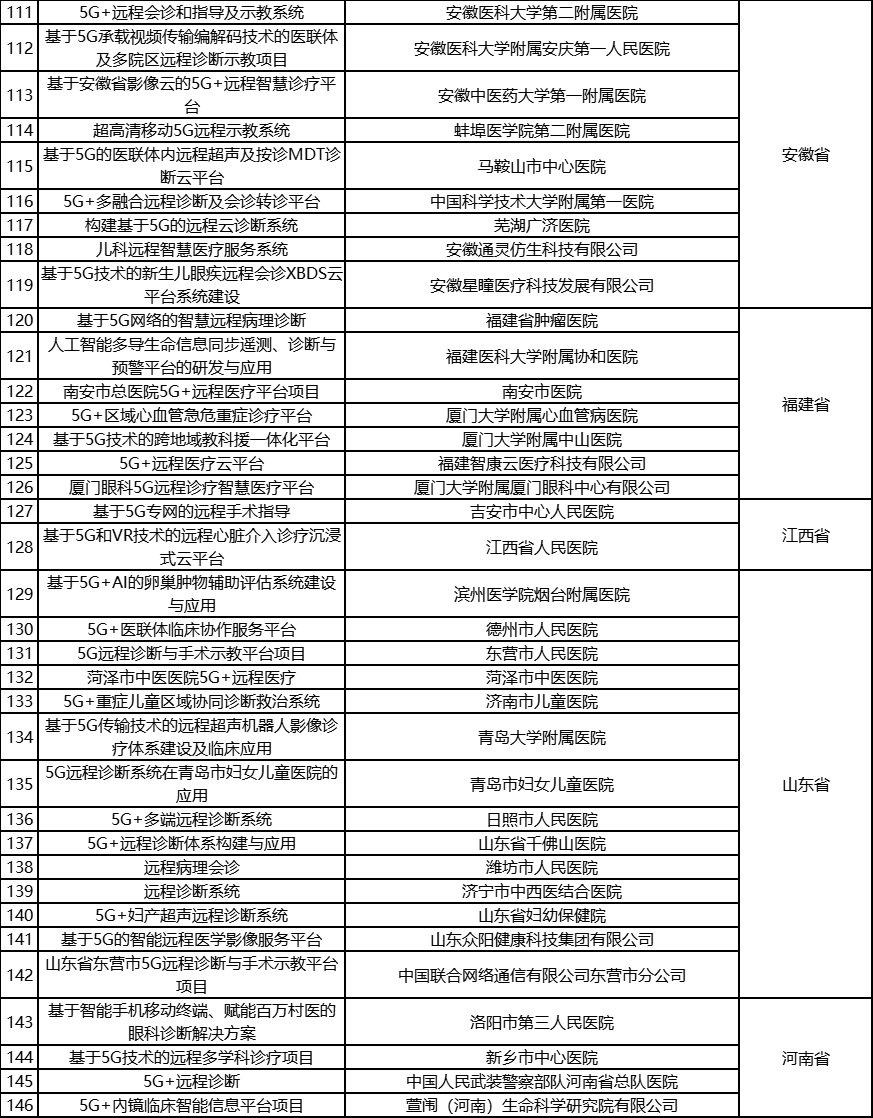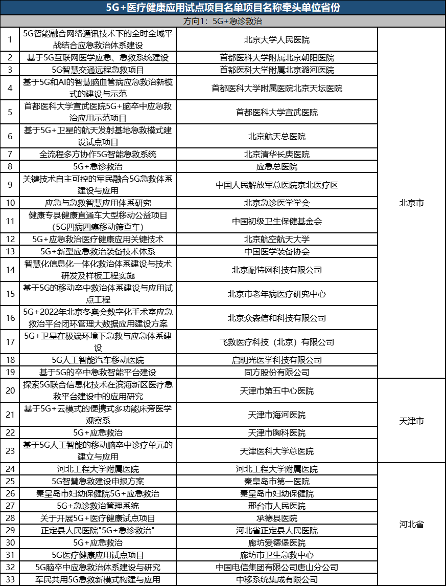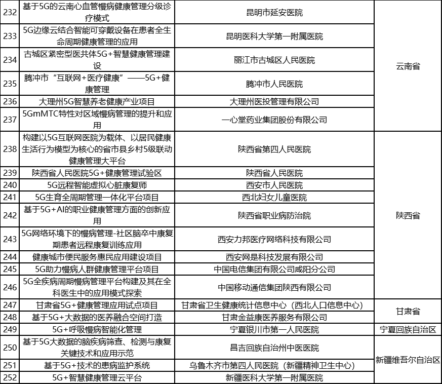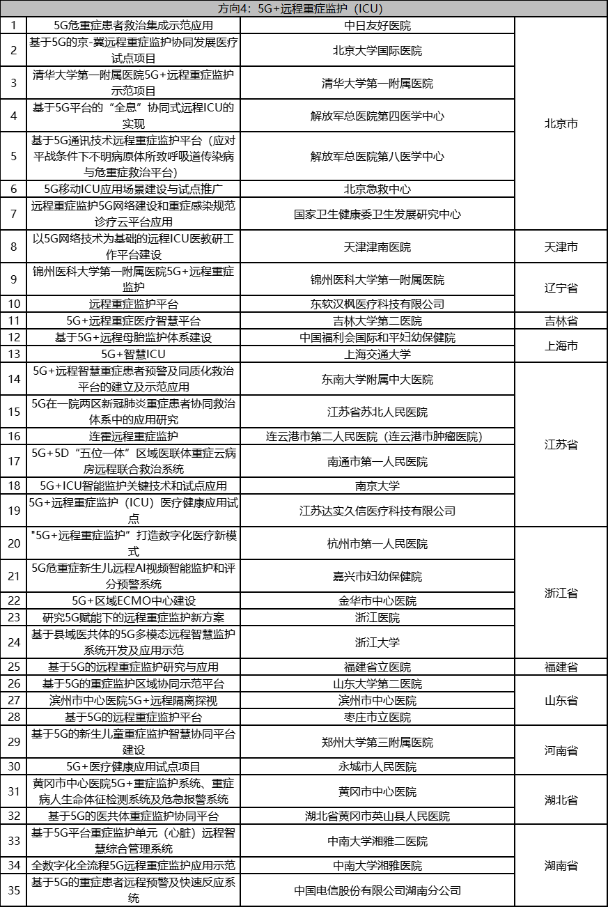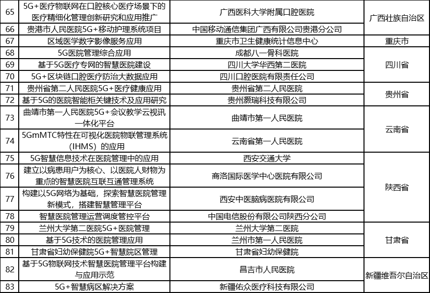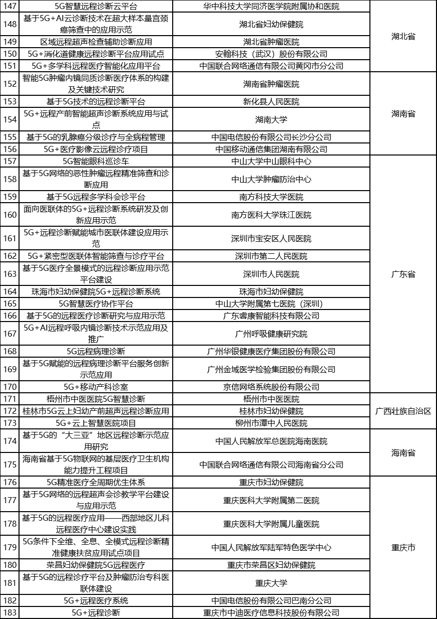 根据《工业和信息化部办公厅国家卫生健康委员会办公厅关于组织开展5G+医疗健康应用试点项目申报工作的通知》(工信厅联通信函〔2020〕270号)有关要求,按照“宽进严出,优中选优”的整体工作思路,经项目申报、专家初审、复审等程序,现将5G+医疗健康应用试点项目名单予以公示。 如有异议,请以书面形式反馈。公示时间:2021年8月17日至8月23日。 联系单位: (一)工业和信息化部信息通信发展司 地址:北京市西城区西长安街13号 邮箱:wangcunxiang@miit.gov.cn 传真:010-66014360 (二)国家卫生健康委员会规划发展与信息化司 地址:北京市西城区西直门外南路1号 邮箱:xxtjc@nhc.gov.cn 传真:010-68791425 |