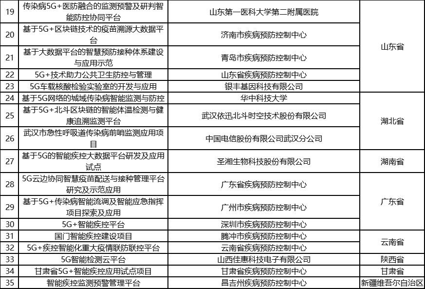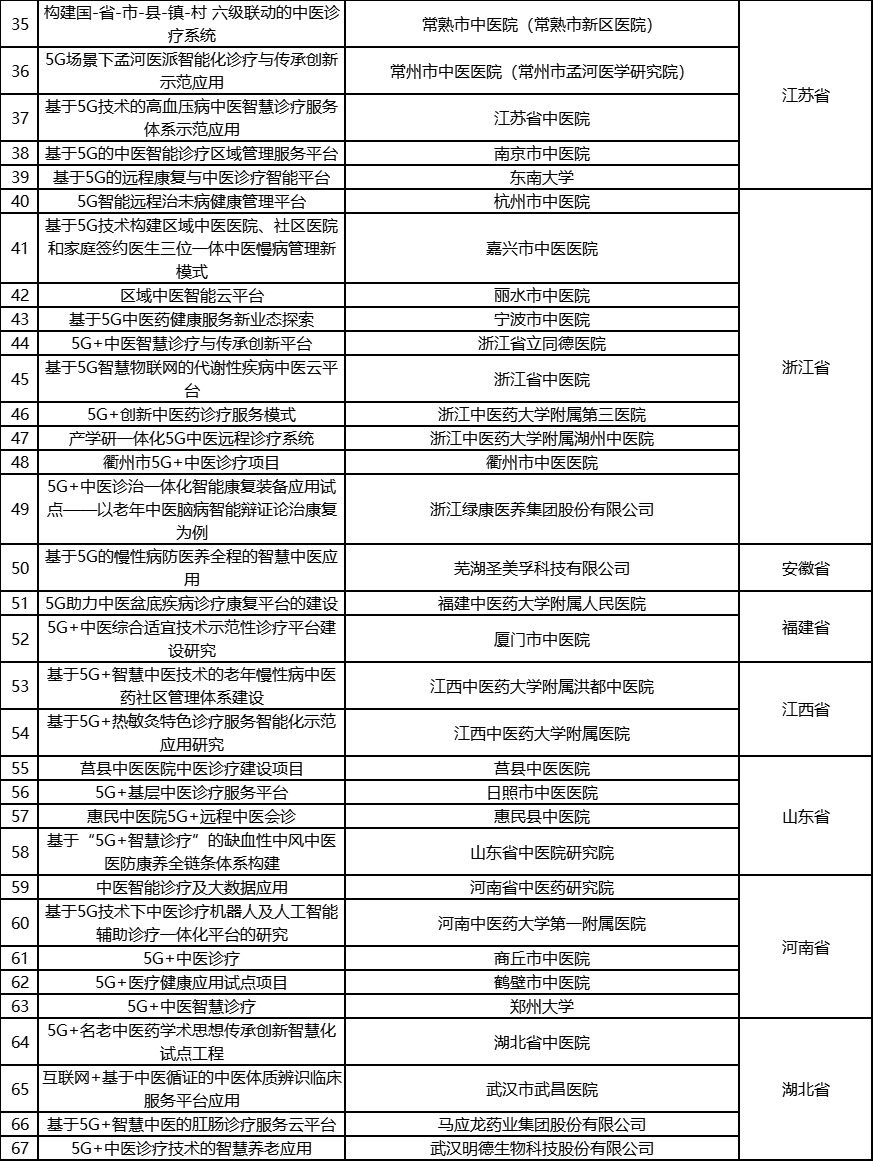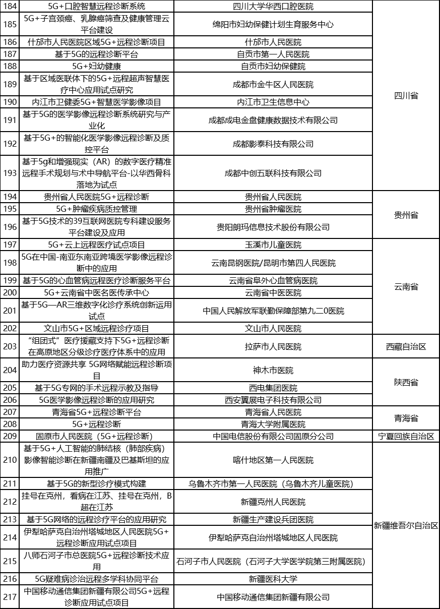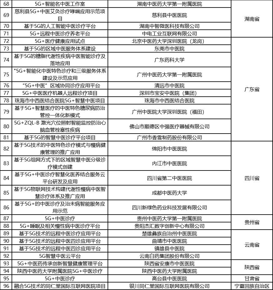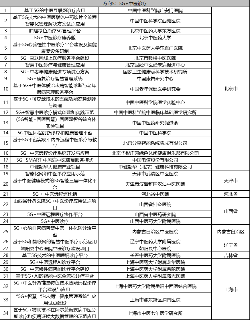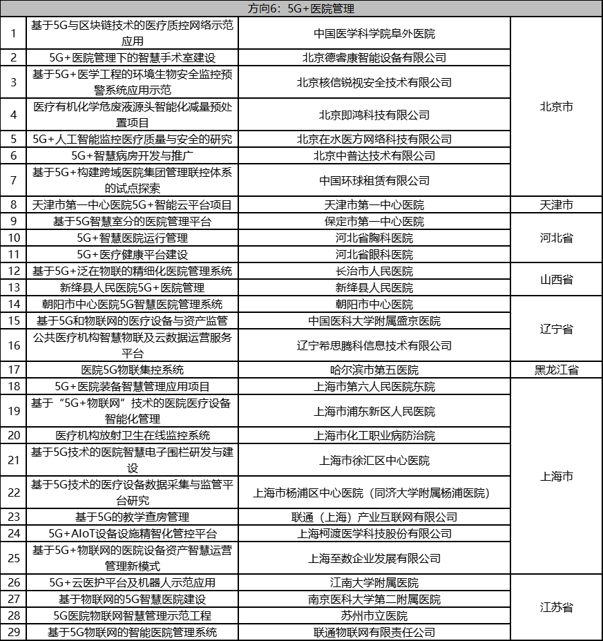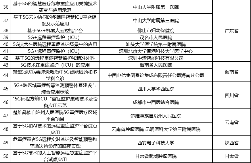 根据《工业和信息化部办公厅国家卫生健康委员会办公厅关于组织开展5G+医疗健康应用试点项目申报工作的通知》(工信厅联通信函〔2020〕270号)有关要求,按照“宽进严出,优中选优”的整体工作思路,经项目申报、专家初审、复审等程序,现将5G+医疗健康应用试点项目名单予以公示。 如有异议,请以书面形式反馈。公示时间:2021年8月17日至8月23日。 联系单位: (一)工业和信息化部信息通信发展司 地址:北京市西城区西长安街13号 邮箱:wangcunxiang@miit.gov.cn 传真:010-66014360 (二)国家卫生健康委员会规划发展与信息化司 地址:北京市西城区西直门外南路1号 邮箱:xxtjc@nhc.gov.cn 传真:010-68791425 |