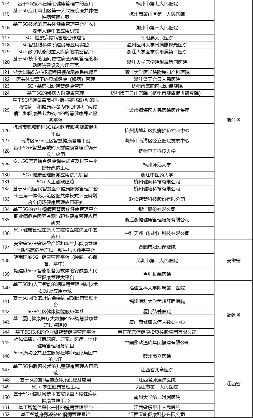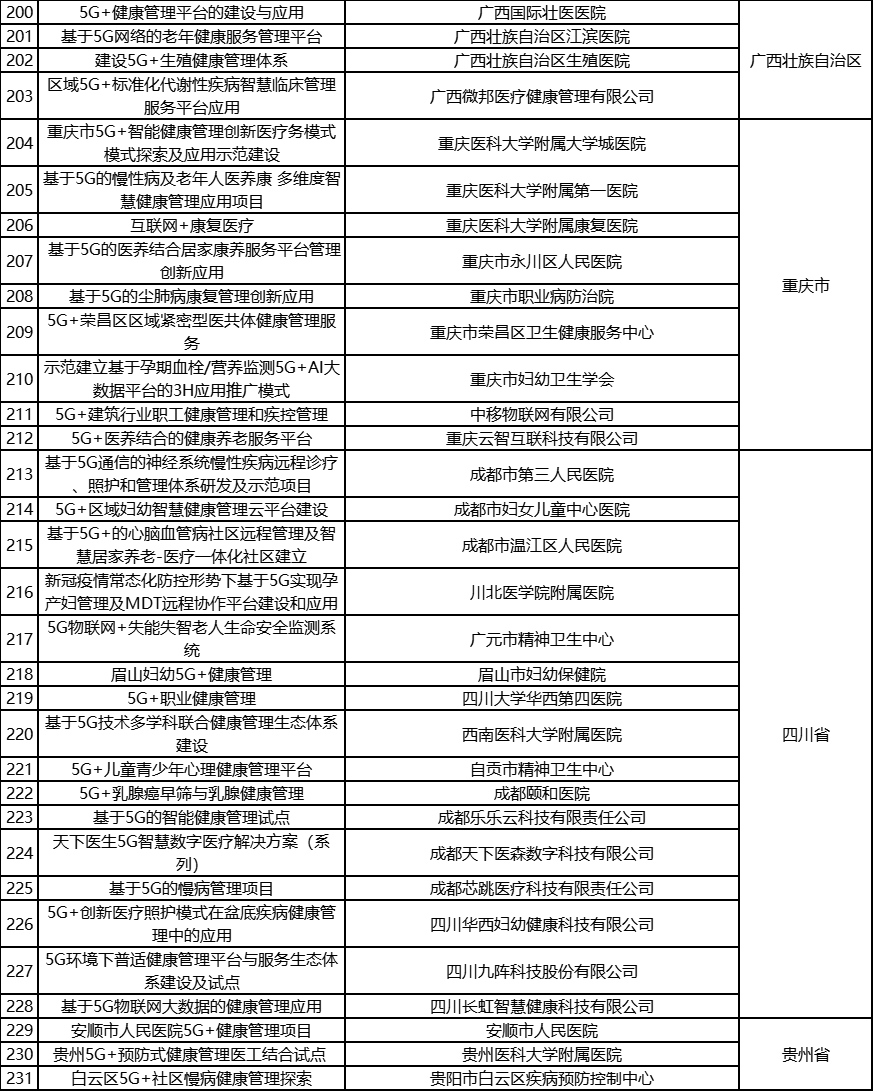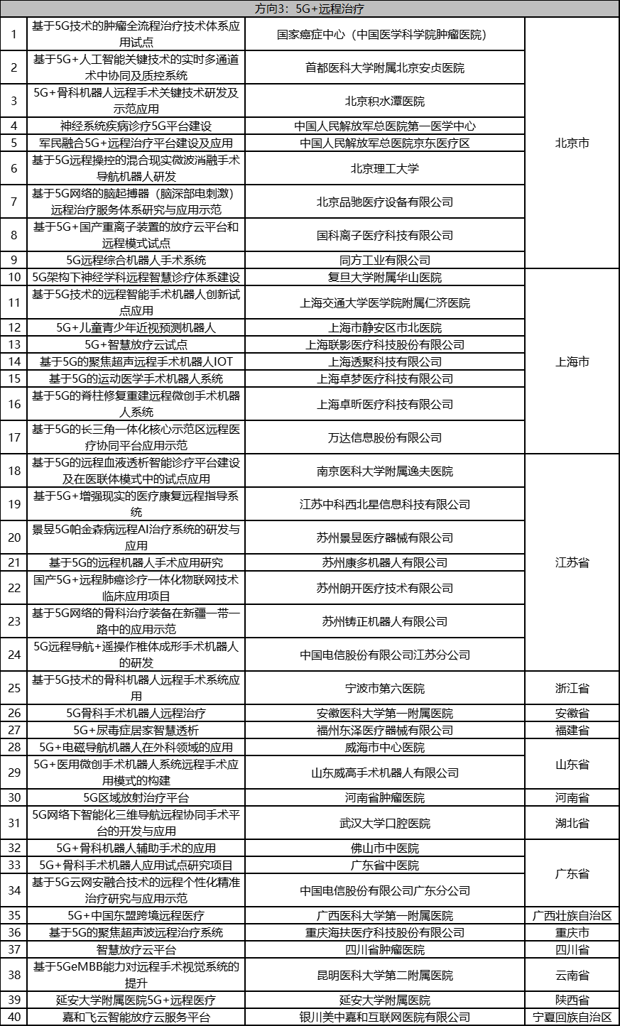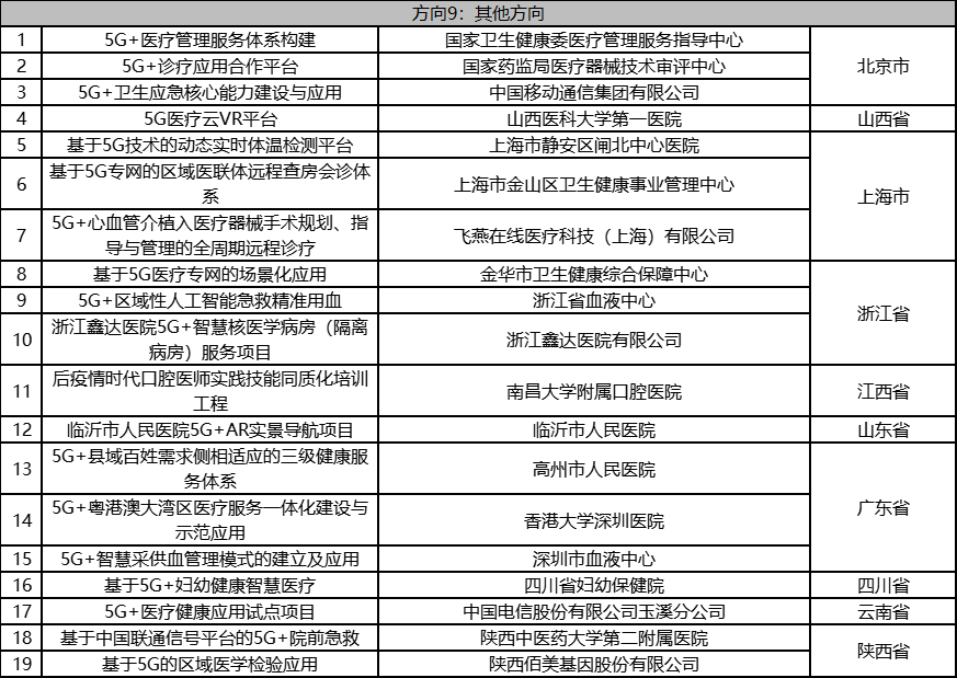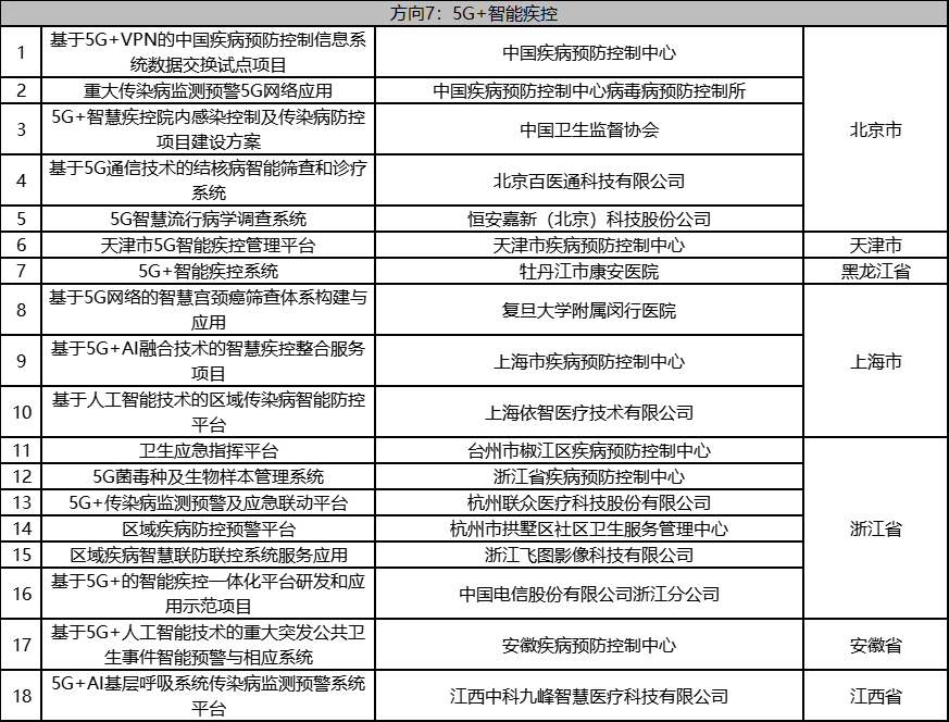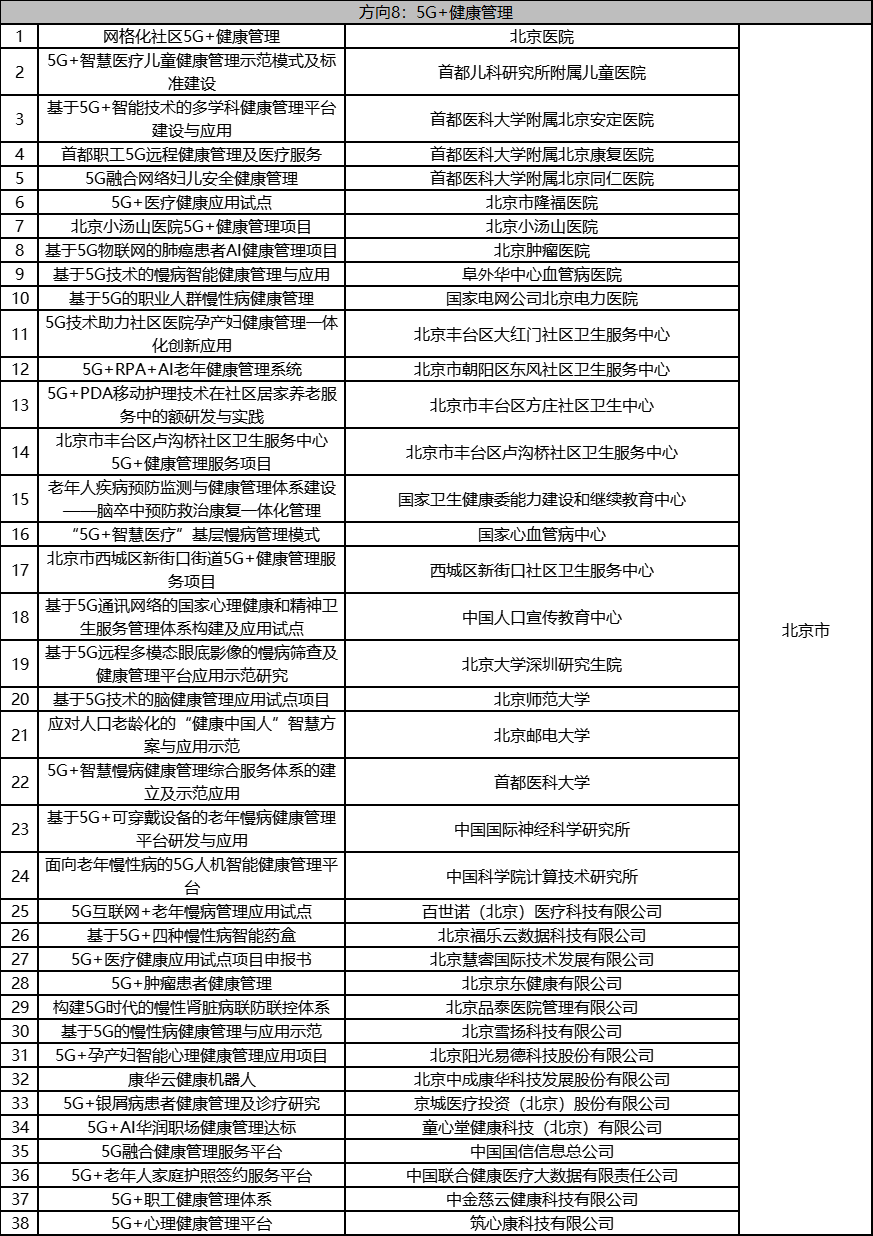 根据《工业和信息化部办公厅国家卫生健康委员会办公厅关于组织开展5G+医疗健康应用试点项目申报工作的通知》(工信厅联通信函〔2020〕270号)有关要求,按照“宽进严出,优中选优”的整体工作思路,经项目申报、专家初审、复审等程序,现将5G+医疗健康应用试点项目名单予以公示。 如有异议,请以书面形式反馈。公示时间:2021年8月17日至8月23日。 联系单位: (一)工业和信息化部信息通信发展司 地址:北京市西城区西长安街13号 邮箱:wangcunxiang@miit.gov.cn 传真:010-66014360 (二)国家卫生健康委员会规划发展与信息化司 地址:北京市西城区西直门外南路1号 邮箱:xxtjc@nhc.gov.cn 传真:010-68791425 |