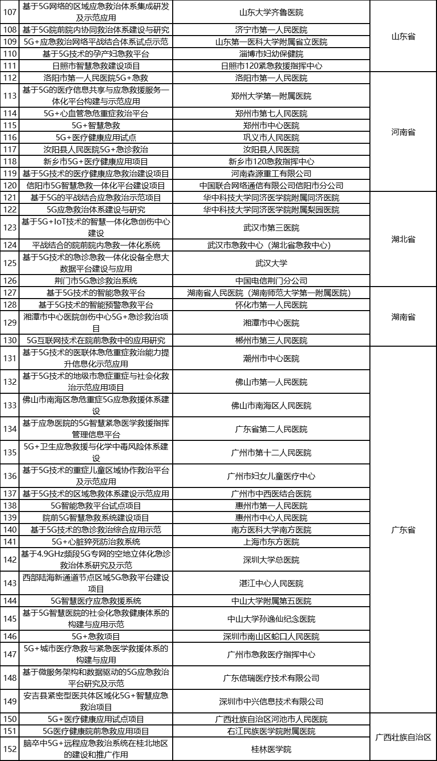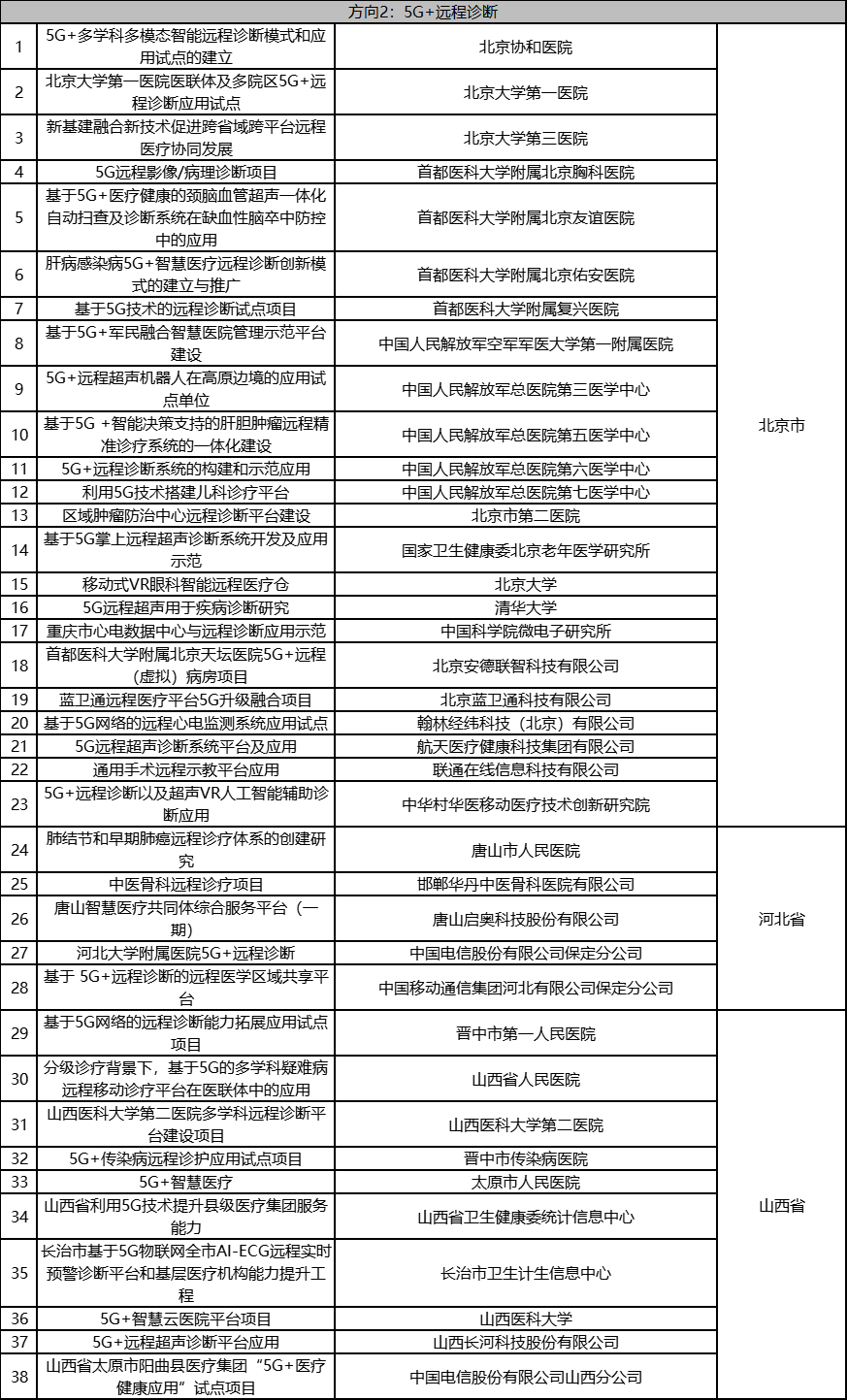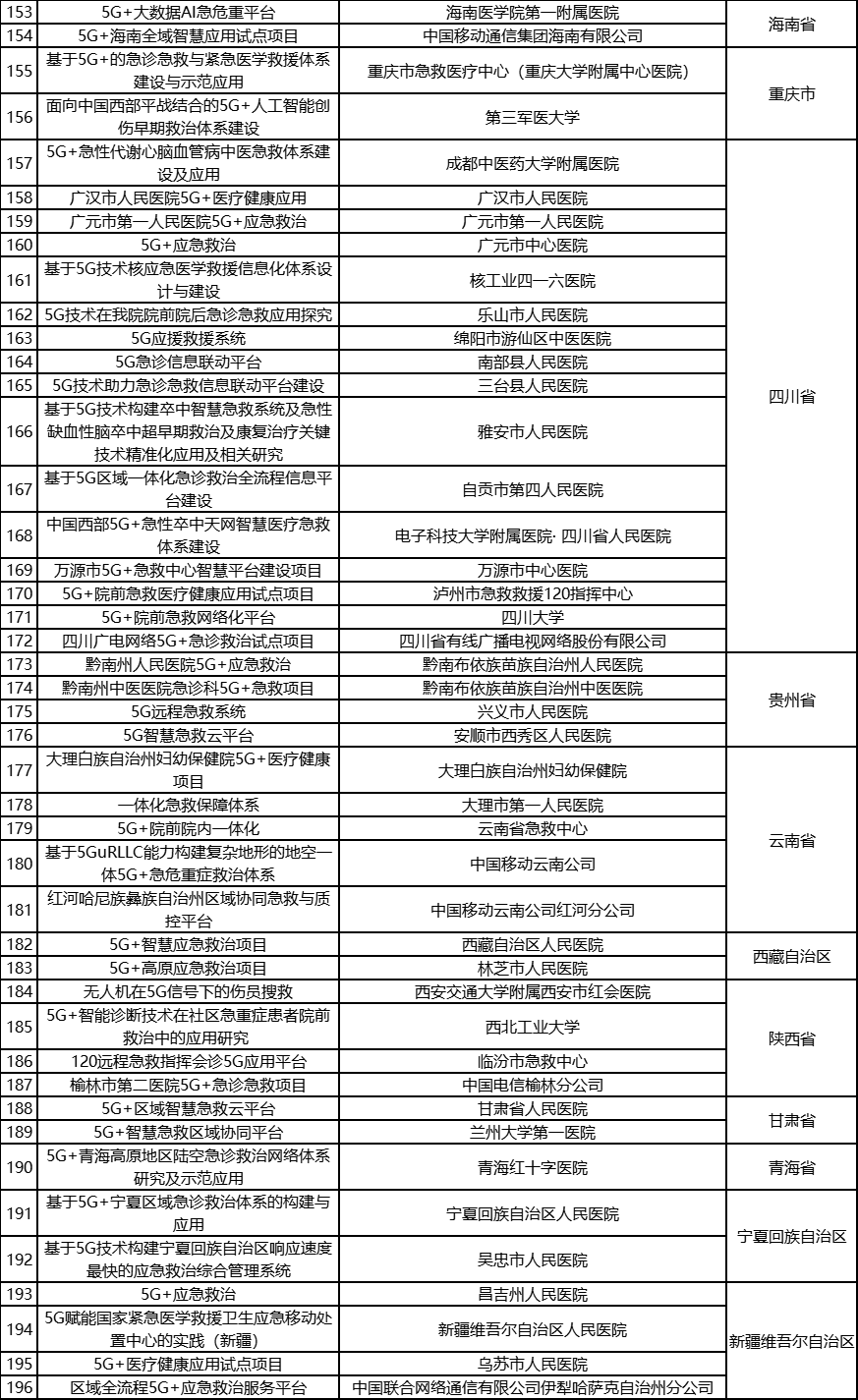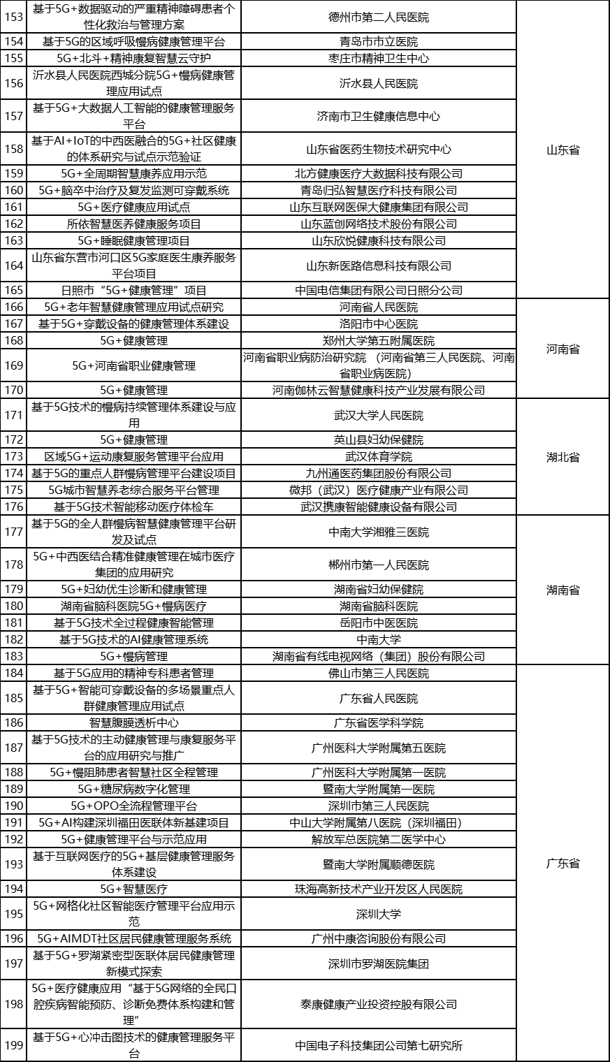 根据《工业和信息化部办公厅国家卫生健康委员会办公厅关于组织开展5G+医疗健康应用试点项目申报工作的通知》(工信厅联通信函〔2020〕270号)有关要求,按照“宽进严出,优中选优”的整体工作思路,经项目申报、专家初审、复审等程序,现将5G+医疗健康应用试点项目名单予以公示。 如有异议,请以书面形式反馈。公示时间:2021年8月17日至8月23日。 联系单位: (一)工业和信息化部信息通信发展司 地址:北京市西城区西长安街13号 邮箱:wangcunxiang@miit.gov.cn 传真:010-66014360 (二)国家卫生健康委员会规划发展与信息化司 地址:北京市西城区西直门外南路1号 邮箱:xxtjc@nhc.gov.cn 传真:010-68791425 |