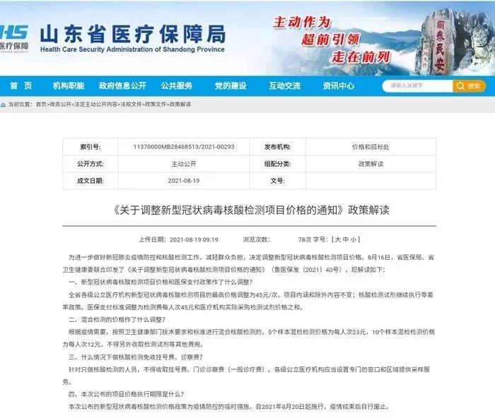 为进一步做好新冠肺炎疫情防控和核酸检测工作,减轻群众负担,8月20日起,山东各级公立医疗机构新型冠状病毒核酸检测项目的最高价格调整为45元/次。日前,省医保局、省卫生健康委联合印发了《关于调整新型冠状病毒核酸检测项目价格的通知》(鲁医保发〔2021〕40号)。8月19日,省医保局发布政策解读。