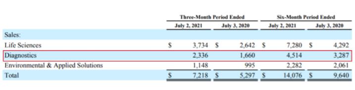 2021上半年,丹纳赫总营收140.76亿美元,同比增长46%。诊断业务营收45.14亿美元,同比增长37%,贡献了总营收的32%。