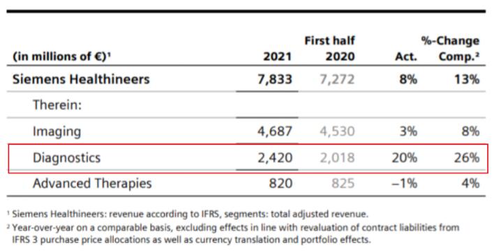 2021年上半年,西门子医疗整体营收78.33亿欧元(约92.99亿美元),同比增长8%。受到市场对COVID-19抗原快速检测的高需求影响,诊断业务营收24.20亿欧元(约28.7亿美元),同比增长20%。