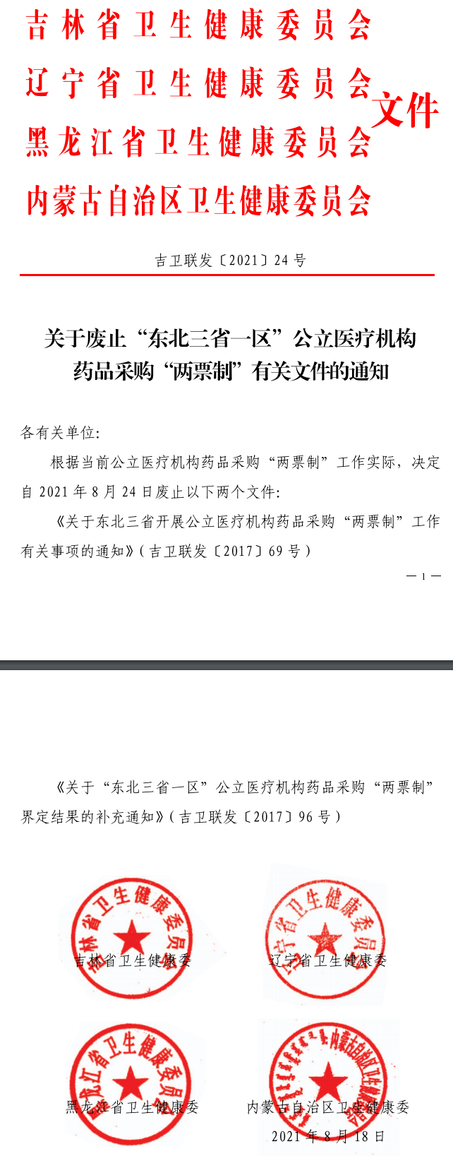 《关于东北三省开展公立医疗机构药品采购“两票制”工作有关事项的通知》和《关于“东北三省一区”公立医疗机构药品采购“两票制”界定结果的补充通知》。