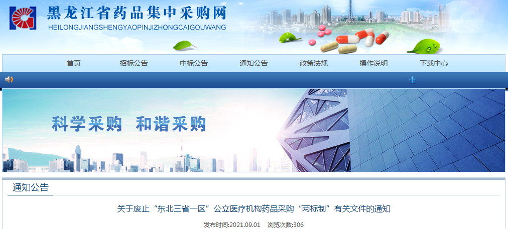 9月1日,黑龙江省药品集中采购网发布了关于废止“东北三省一区”公立医疗机构药品采购“两票制”有关文件的通知。