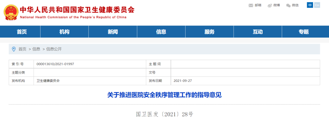 9月27日,国家卫生健康委员会等八部门联合发文《关于推进医院安全秩序管理工作的指导意见》,意见明确强调:医院应当建立安全检查制度,按照安检工作实际需求,配备通过式金属探测门、微剂量X射线安全检查设备、手持式金属探测器等相应安检设备。日均门诊量5000人次以上或者床位1000张以上的大型医院应当在主要出入口实施安检。防止人员携带刀具、爆炸物品、危险物品进入医院。