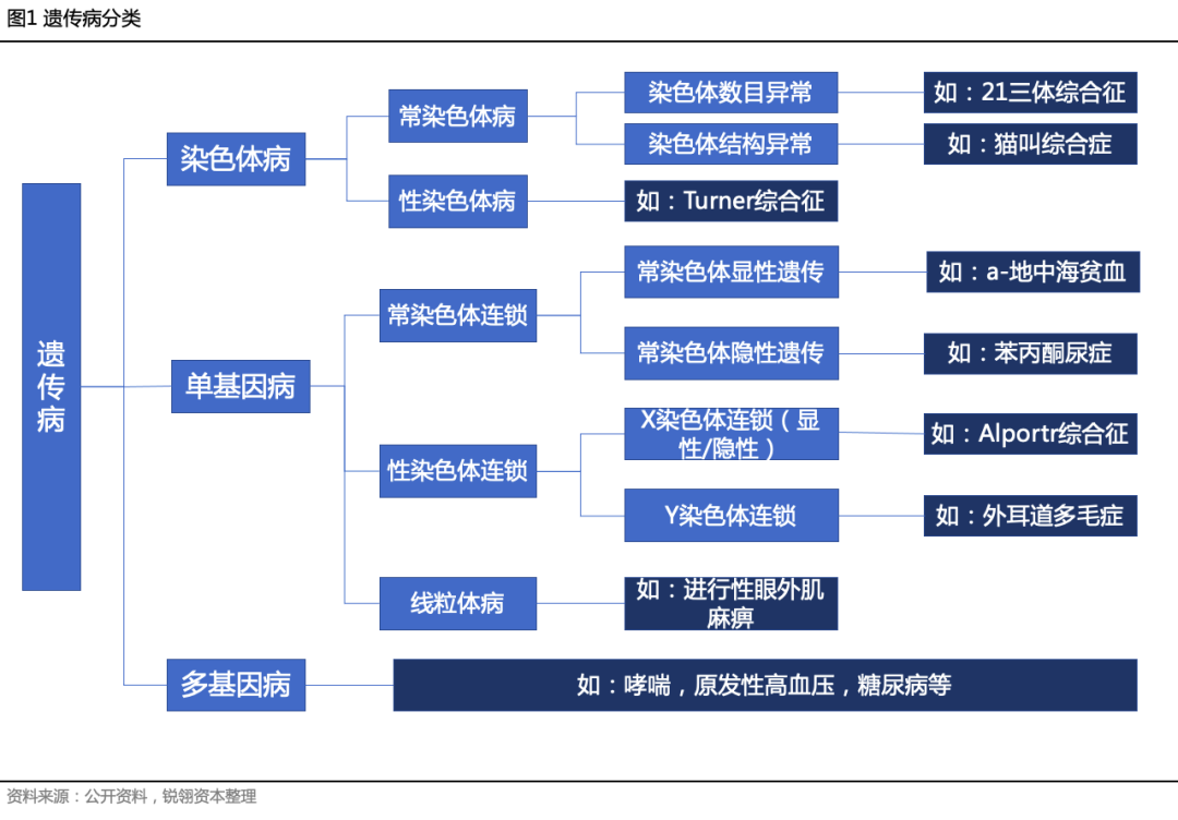 导读 在目前的临床基因检测市场当中,NIPT和肿瘤伴随诊断占据了大部分市场份额,除了继续在现有产品上提高份额外,开启新的产品增长点也将是重中之重。遗传病基因检测作为目前基因测序行业一项较为成熟的技术,很有可能在下一阶段获得政策支持,成为基因测序行业新的热点。笔者将对目前遗传病诊疗现状、市场容量以及行业内企业的市场竞争要素做简要分析。 4.1 样本采集处理与检测 4.2 生物信息学分析流程 4.3 检测报告解读 4.4 数据解读价值分析 遗传病是指由遗传物质发生改变而引起的或者是由致病基因所控制的疾病,常为先天性的,也可后天发病,如先天愚型、多指(趾)、先天性聋哑、血友病等。约50%的遗传病患者在出生时或儿童时期发病,约30%的遗传病儿童寿命不超过5岁。也有的遗传病要经过几年甚至几十年后才能出现明显症状。遗传病主要可以分为染色体病、单基因病和多基因病。 染色体病(chromosomal disorders)是由于各种原因引起的染色体数目和(或)结构异常的疾病。由于染色体上基因众多,加上基因的多效性,因此染色体病常涉及多个器官、系统的形态和功能异常,临床表现多种多样,常表现为综合征,故染色体病是一大类严重的遗传病。染色体畸变严重者在胚胎早期死亡并自然流产,少数染色体畸变者能存活至出生,常造成机体多发畸形、智力低下、生长发育迟缓和多系统功能障碍。染色体病无有效治疗方法,因此通过染色体病的遗传咨询和产前诊断预防染色体病尤为重要。单基因遗传病是指受一对等位基因控制的遗传病,据OMIM数据库(人类孟德尔病数据库)数据,单基因遗传病的病种数量有7000多种,其中约4000多种致病基因和发病机制比较明确。单基因遗传病单个发病率低,但单基因病种类极多,累积起来可达到这个全球出生人口数的1%,所以总体发病率高,且具有先天性、致死致残性的特点。另外,一些单基因遗传病,其本身的发病率就很高,比如马凡综合征、药物性耳聋等。由于染色体异常发生率低且通常能在产前被检测出来,因此新生儿/儿童发病的通常是单基因遗传病。就诊断而言,单基因遗传病涉及多个学科,临床症状复杂,且由于基因的突变具有多样性,每种突变都可能导至不一样的临床症状,而突变的临床意义也相当复杂,具有高度遗传异质性和临床异质性,故临床诊断困难。而且,许多遗传病都及其罕见,属于罕见病(中国没有明确的罕见病定义,根据WHO的定义,罕见病是患病人数占总人口的0.65‰到1‰的疾病。80%的罕见病是单基因遗传病)。对于一名医生来说,诊断经验不足,根据症状极易误诊。所以对于临床医生而言,这些问题显得颇有挑战性:比如如何根据患者症状快速鉴别其是否为遗传病;患者表现为某些特定症状时,哪种基因突变的概率最大?如今,随着基因测序成本的大幅下降,随之而来的是基因大数据的出现,在这种形势下,基于基因型和表型的关系,建立辅助诊断系统和临床知识库是一条容易且有效的路径。我们目前了解比较清楚、遗传关系和疾病关联很明确的是染色体病和单基因病,基因检测也多半在这个领域,多基因病目前还停留在科研阶段。基因检测主要针对样本在染色体、DNA、RNA和(或)基因产物等层面进行分析。明确的遗传诊断对遗传病的早期诊断、早期干预、遗传咨询和生育指导具有重要意义。 |