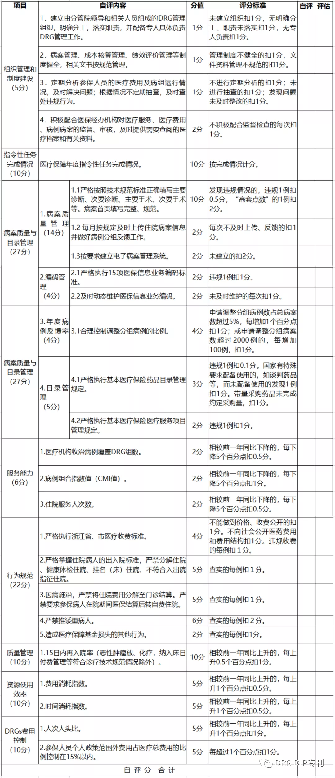 (二)年度评价。分自评和被评两个阶段。每年初医疗机构按照《医疗机构DRGs点数付费改革绩效评价表》所列项目对上一年度的工作开展自评,如实填报自评分。医保部门组织有关部门和专家组成年度评价组,对医疗机构执行DRGs点数付费改革工作开展评价,对医疗机构自评情况开展审核和复查,按《评价表》所列项目给予赋分。
