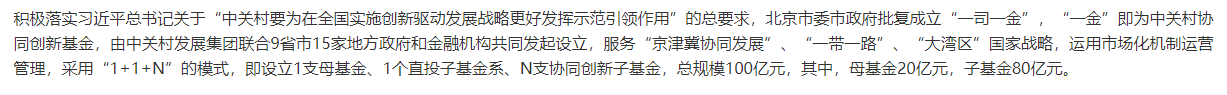 摘要: 积极落实习近平总书记关于“中关村要为在全国实施创新驱动发展战略更好发挥示范引领作用”的总要求,北京市委市政府批复成立“一司一金”,“一金”即为中关村协同创新基金