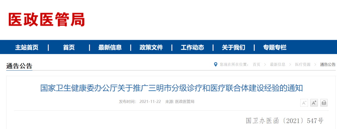 南方医学网讯:11月22日,国家卫健委发布关于推广三明市分级诊疗和医疗联合体建设经验的通知。通知提及,进一步推广三明市分级诊疗和医联体建设经验,以组建紧密型医联体为载体,推进医保支付方式改革,着力构建分级诊疗格局。