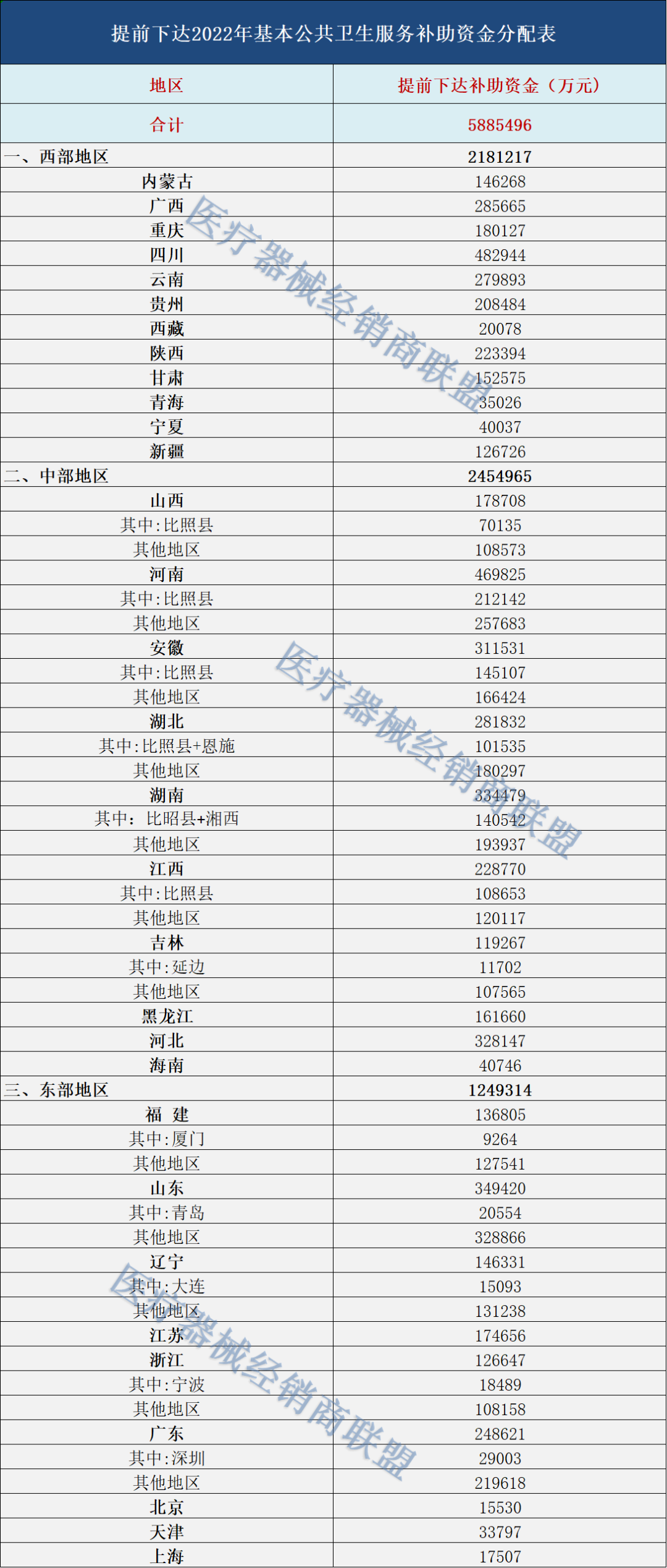 近期,国家卫健委、财政厅联合发布了《关于提前下达2022年重大传染病防控经费预算的通知》。《通知》明确,提前下达155.7亿元财政经费,用于扩大国家免疫规划、艾滋病防治、结核病防治、血吸虫与包虫病防治、精神卫生与慢性非传染性疾病防治、新冠肺炎等重点传染病监测等工作。值得关注的是,早在2019年国家卫健委下发了《重大传染病防控补助资金管理办法》中,曾明确要求:重大传染病防控补助资金主要用途,包括加强实验室建设和设备配置能力建设。这意味着相关医疗设备配置与实验室建设,将继续在2022年迎来强需求!与此同时,国家财政部还同步下发了《关于提前下达2022年基本公共卫生服务补助资金预算的通知》,相比2021年,本次提前下发的2022年基本公卫补助资金明显增加,共计588.5亿元。从资金分配表中可以看出来,2022年的基本公卫补助资金约为588.55亿元。其中,中西部地区的补助资金较多,都超过了200亿元,获得资金较靠前的省份有四川、河南、山东、湖南等省份。近期,国家财政部发布了多则关于提前下达2022年补助资金预算的通知,包括79.89亿公立医院综合改革补助资金、48.4216亿元医疗卫生机构能力建设补助资金。加上上述补助资助金,2022年可用于卫生健康领域的补助资金已高达872.51亿。而在这近900亿元的补助资金中,接近一大半都将投入基层用于提升基本公卫服务。无疑,后疫情时代随着国家对于基层公卫建设的新要求,将诞生更多的行业新机遇。比如,用于新冠肺炎等重点传染病检测项目,与之相关的设备配置将是首选需要解决的问题。此前,国家卫健委就已发布文件对公共卫生防控救治能力建设的设备配置进行了明确,要求:与此同时,针对突发公共卫生事件方面存在救治能力不足的问题,国家卫健委指出,目前县级医院平均配置呼吸机9.7台(最少0台,最多24台),其中呼吸内科、急诊科、重症医学科平均配置2.3台、1.9台和5.5台,东中西部呈现配置数量递减趋势。贫困县医院平均配置6.5台,呼吸内科、急诊科和重症医学科平均配置数也均低于县级医院整体水平。这也就意味着,随着补助资金的提前下发,各大基层医疗机构也将进一步补齐缺失的医疗设备,从而提升综合医疗服务能力,完成国家下达的任务指标。基层医疗机构设备配置! 多地明确:拒绝进口,只要国产! 不难发现,近年来各省基层医疗卫生机构采购医疗设备,都明确只要国产,拒绝进口。比如前段时间,湖南省卫生健康委员会2021年省级补助基层医疗卫生机构医疗设备采购项目中标结果出炉。总预算近亿元采购793台医疗设备,明确拒绝进口产品产品,只要国产!襄城县卫健委对范湖乡等10个乡镇卫生院采购医疗设备项目中,同样点名只要国产医疗设备。还有广东省南雄市卫生健康局,近4000万预算采购289台/套医疗设备,最终国产设备全部中标。无疑,随着国家财政对于基层医疗机构建设的大力支持,高性价比的国产医疗设备将成为基层首选。