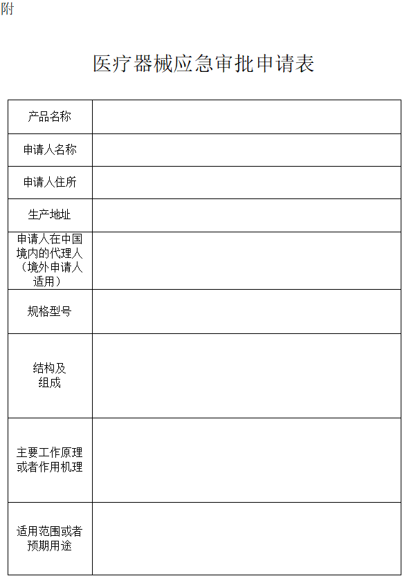 为有效预防、及时控制和消除突发公共卫生事件的危害,确保突发公共卫生事件应急所需医疗器械尽快完成审批,根据《医疗器械监督管理条例》(国务院令第739号)及《医疗器械注册与备案管理办法》(市场监管总局令第47号)、《体外诊断试剂注册与备案管理办法》(市场监管总局令第48号),国家药品监督管理局组织修订了《医疗器械应急审批程序》,现予发布,自发布之日起施行。原国家食品药品监督管理局《关于印发医疗器械应急审批程序通知》(国食药监械〔2009〕565号)同时废止。 特此公告。 国家药监局 医疗器械应急审批程序 第一条 为有效预防、及时控制和消除突发公共卫生事件的危害,确保突发公共卫生事件应急所需医疗器械尽快完成审批,根据《医疗器械监督管理条例》《医疗器械注册与备案管理办法》《体外诊断试剂注册与备案管理办法》等法规和规章,制定本程序。 第二条 存在突发公共卫生事件威胁时,以及突发公共卫生事件发生后,药品监督管理部门按照统一指挥、早期介入、随到随审、科学审批的原则,对突发公共卫生事件应急处理所需医疗器械实施应急审批。 第三条 国家药监局根据突发公共卫生事件的情形和变化情况,决定启动及终止本程序的时间。本程序启动后,各级药品监督管理部门及相关技术机构,根据各自职能和本程序规定,开展相关医疗器械的检验、质量管理体系考核、技术审评和行政审批等工作。 第四条 本程序适用于突发公共卫生事件应急所需,且在我国境内尚无同类产品上市,或虽在我国境内已有同类产品上市,但产品供应不能满足突发公共卫生事件应急处理需要,并经国家药监局确认的境内第三类和进口第二类、第三类医疗器械的审批。 第五条 申请医疗器械应急审批的,境内注册申请人应当将产品应急所需的情况及产品研发情况告知相应的省、自治区、直辖市药品监督管理局,省、自治区、直辖市药品监督管理局应当及时了解相关医疗器械研制情况,必要时采取早期介入的方式,对拟申报产品进行评估,并及时指导注册申请人开展相关申报工作。 第六条 申请境内第三类和进口第二类、第三类医疗器械应急审批的,应当向国家药监局受理部门提交《医疗器械应急审批申请表》和产品研究综述资料及相关说明。 第七条 国家药监局组织专家,通过会议、函审、书面征求意见等方式对申请应急审批的医疗器械和国家应急响应工作机制书面推荐的应急所需医疗器械是否符合本程序第四条要求,以及研发成熟度、生产能力等进行评估,及时对产品是否进行应急审批予以确认,并将结果通知申请人、相应技术机构、省、自治区、直辖市药品监督管理局。 第八条 对于经国家药监局确认进行应急审批的医疗器械(以下简称应急审批医疗器械),如委托药品监督管理部门医疗器械检验机构开展检验的,相关医疗器械检验机构应当在接收样品后24小时内组织开展医疗器械检验,并及时出具检验报告。相关检验能力不足时,国家药监局可以指定具有检验能力的医疗器械检验机构开展检验。 第九条 对于应急审批医疗器械,国家药监局医疗器械技术审评中心应当指定专人,早期介入,按照注册申请人需求,通过适当方式开展咨询,指导注册申报资料准备,并按照医疗器械审评工作要求,对企业拟提交注册的资料按照随到随审原则开展受理前预审查。 第十条 对于应急审批医疗器械,相应的省、自治区、直辖市药品监督管理局应当在接到国家药监局通知后2日内组织开展质量管理体系核查,并及时出具质量管理体系核查报告,提交国家药监局医疗器械技术审评中心。 第十一条对于应急审批医疗器械,注册申请人在申报表中勾选“应急审批”,国家药监局医疗器械技术审评中心于当天完成注册申请事项的签收并按照国家药监局立卷审查要求开展立卷审查。 第十二条 境内和进口第三类应急审批医疗器械注册申请受理并确认缴费转入技术审评阶段后,国家药监局应当在10日内完成技术审评;技术审评结束后,在3日内完成行政审批。 进口第二类应急审批医疗器械注册申请受理并确认缴费转入技术审评阶段后,国家药监局应当在5日内完成技术审评;技术审评结束后,在3日内完成行政审批。 第十三条 对于应急审批医疗器械,注册人所在地省、自治区、直辖市药品监督管理局在接到相关医疗器械生产许可申办或变更申请后,应当按照《医疗器械生产监督管理办法》的相关规定,在受理后5日内做出是否予以核发或变更医疗器械生产许可证的决定。 第十四条 对于应急审批医疗器械,附条件批准上市的,医疗器械注册证的有效期与注册证注明的附带条件的完成时限一致,原则上不超过1年。如注册人完成附带条件,可以在到期之日前申请办理延续注册,符合要求的给予延续注册,注册证有效期为5年。 第十五条 对于应急审批医疗器械,自确认应急审批之日起90日内,如注册申请人无法按照注册要求完成注册申报资料准备并获得注册申请受理,不再按照应急审批办理,原则上可以参照《医疗器械优先审批程序》,受理后优先审评审批。 第十六条 省、自治区、直辖市药品监督管理局可参照本程序制定本辖区内应急审批程序,用于本辖区内境内第二类医疗器械应急审批工作,并将相关程序报国家药监局。 第十七条 各省、自治区、直辖市药品监督管理局应当加强