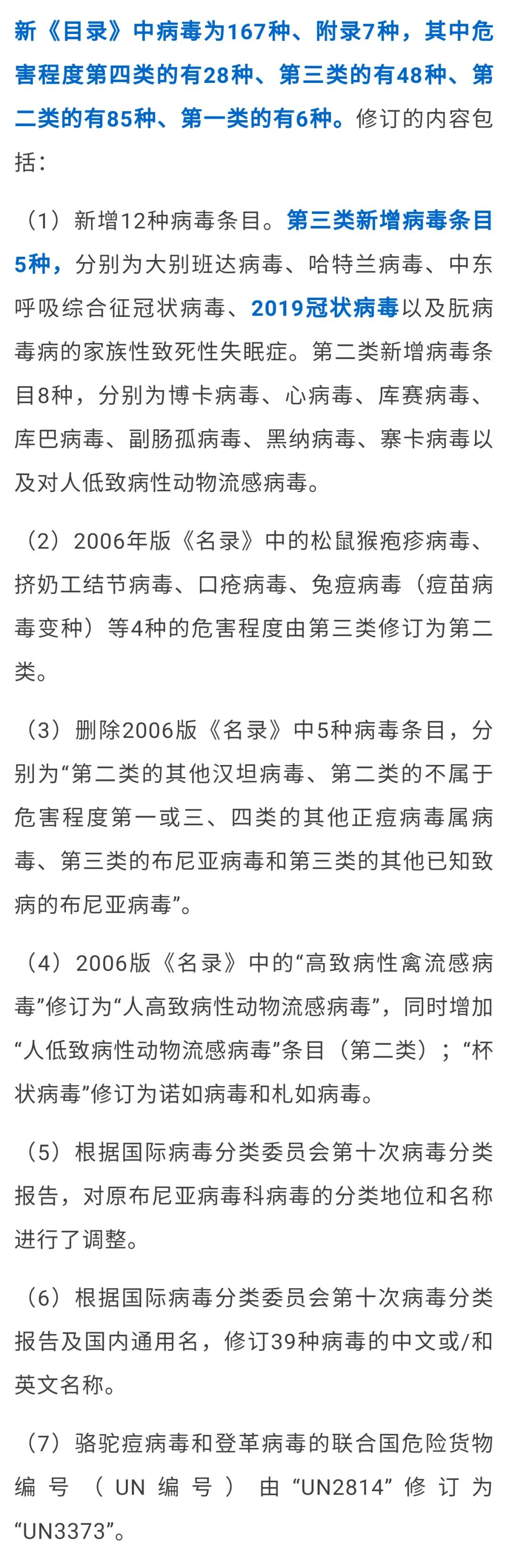 新《目录》的分类将与世卫组织的分类接轨,按病原微生物的危害程度由高到底分为第四类、第三类、第二类、第一类。其中,第四类有28种、第三类有71种、第二类有394种、第一类有6种,合计499种。