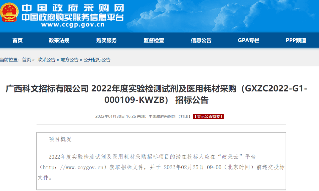 2022年1月30日,中国政府采购网发布一则广西壮族自治区疾病预防控制中心委托的招投标通知(以下简称《通知》),《通知》对广西壮族自治区2022年度实验检测试剂及医用耗材进行采购,预算总金额为1280万元,采购需求分为4个标项,所有标项只要国产检测试剂