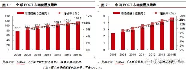POCT是体外诊断领域重要发展方向 POCT是体外诊断行业最快的增长领域 POCT 是Point of Care Testing 的简称,是体外诊断(IVD) 行业的子行业。通过简化设计和技术创新,POCT实现便捷、快速在患者身边现场检查,快速取得诊断结果。目前POCT产品已被广泛应用在医院ICU、手术、急诊、诊所及患者家中,能够进行绝大多数常规临床指标的检测。 POCT是近几年体外诊断行业重要的发展方向和增长最快的领域。2012年全球POCT市场规模约100亿美元,并保持8%复合增速。 POCT
