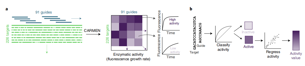 研究团队主要关注CRISPR–Cas13a,其中Cas13a酶使用guide RNA定位靶标,切割荧光报告物的附带活性,导至诊断读数。团队设计了一个库,包含19209个独特的LwaCas13a guide-target对,使用CARMEN进行测试,CARMEN是一个基于液滴的平台,执行平行检测反应。该文库具有代表病毒多样性的序列组成,每个guide和target之间平均有2.9个错配,以及多种PFS等位基因。在每对反应过程中,完整的reporter由于Cas13a裂解而呈指数衰减,因此可以使用衰减的负数来模拟荧光随时间的变化并确定其生长速率。