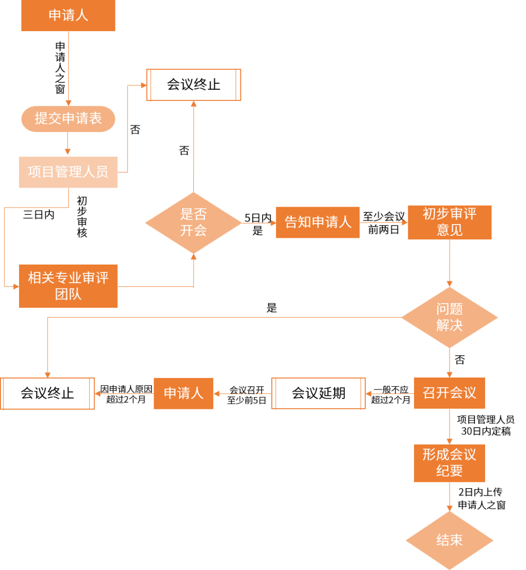 ※ 特别注意:对于技术指南明确、药物临床试验有成熟研究经验,申请人能够保障申报资料质量的,或国际同步研发的国际多中心临床试验申请,在监管体系完善的国家和地区已经获准实施临床试验的,申请人可不经沟通交流直接提出临床试验申请。 III类: 除Ⅰ类和Ⅱ类会议之外的其他会议。 02申请沟通交流会会议流程: