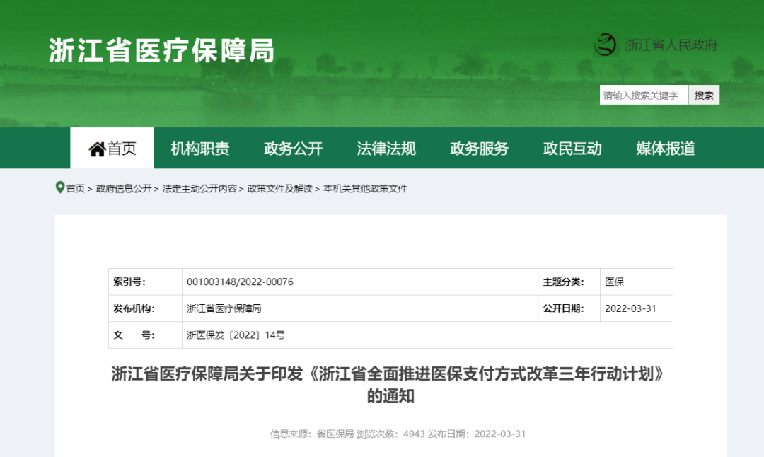 3月29日,浙江省医疗保障局关于印发《浙江省全面推进医保支付方式改革三年行动计划》的通知(以下简称通知)。