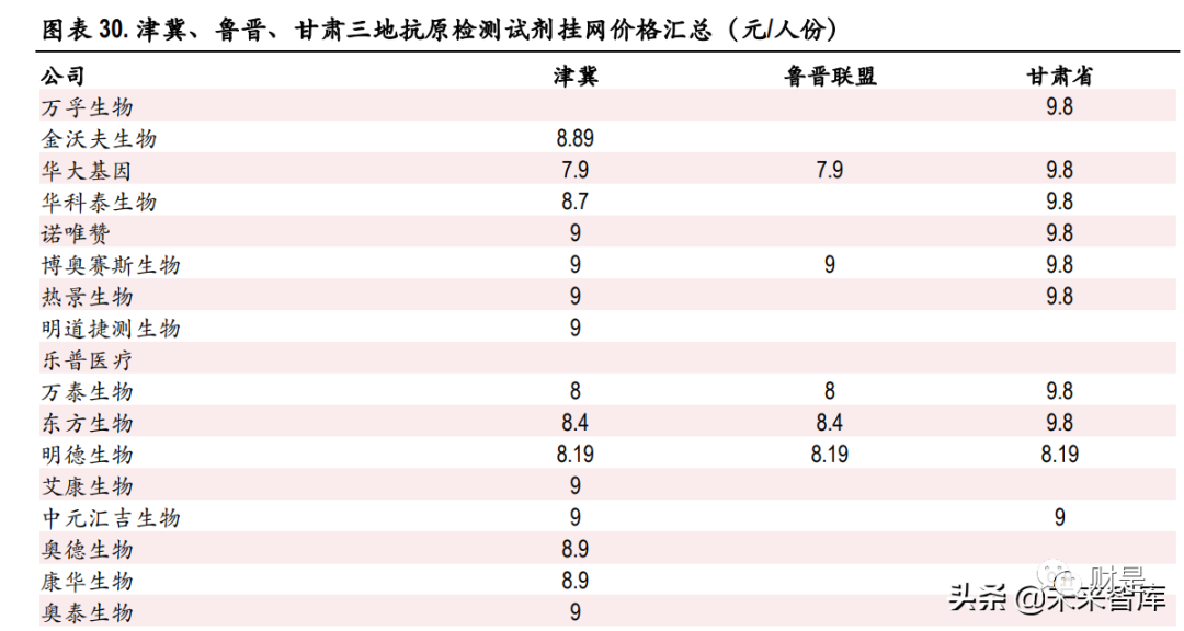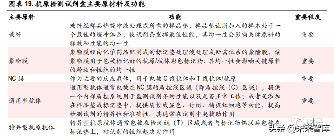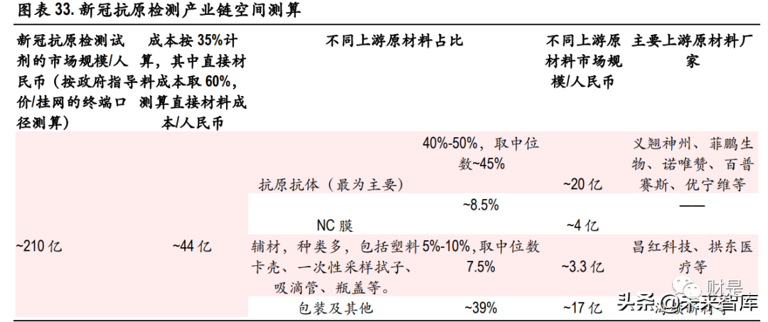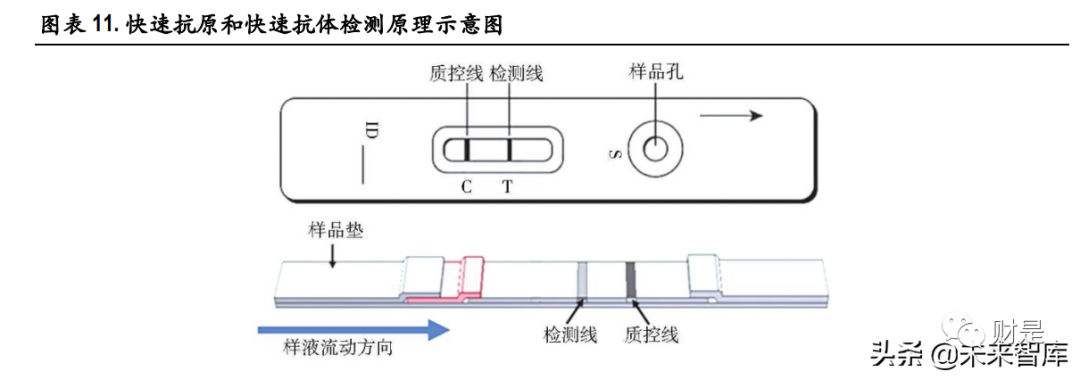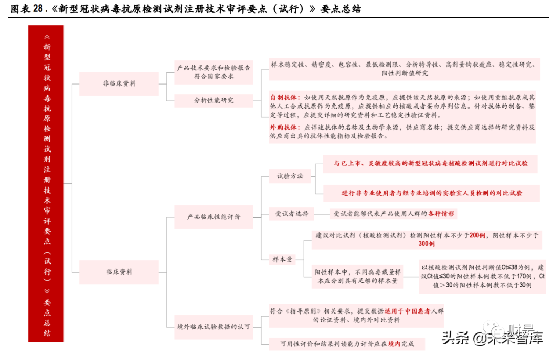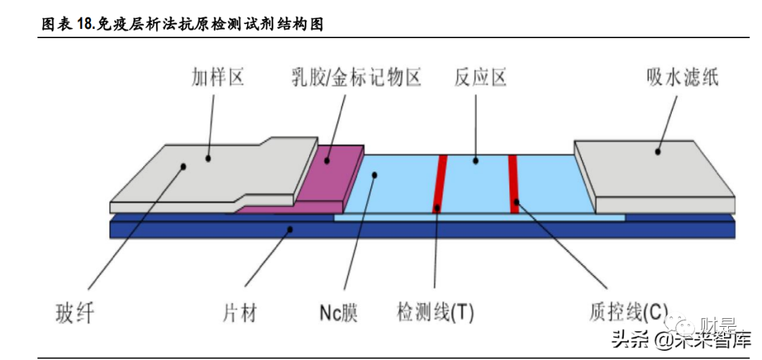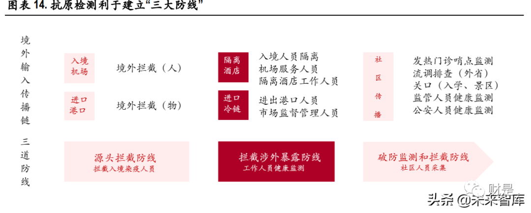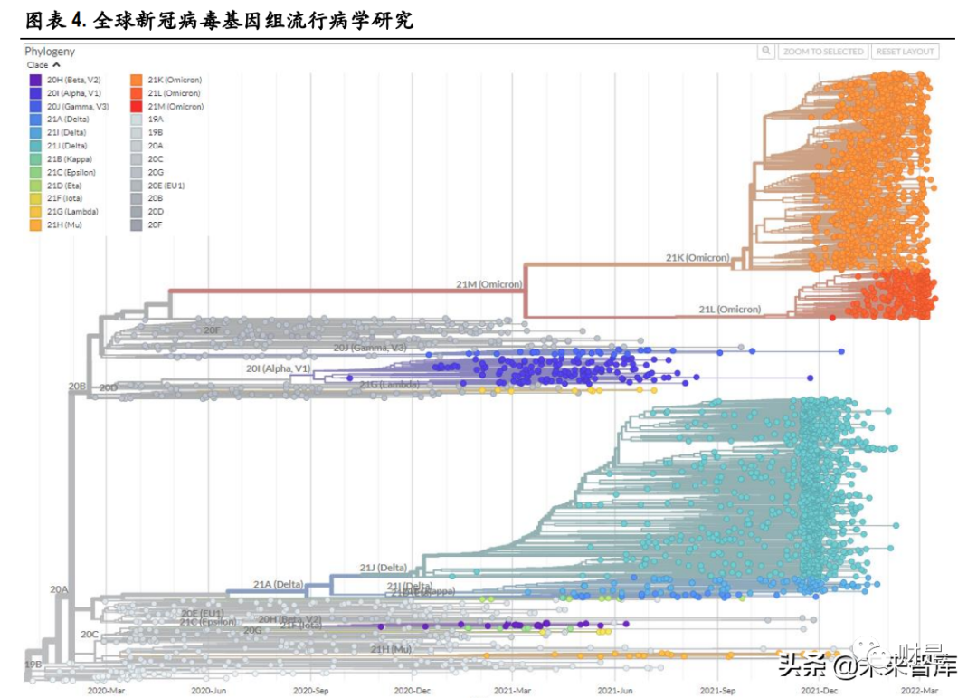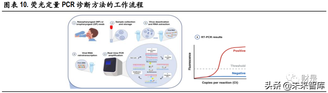 (报告出品方/作者:中银证券,邓周宇) 1、谈谈新冠病毒那些事新冠病毒变异毒株分类 2019 年底新冠疫情爆发, 2020 年 1 月下旬起蔓延至全国。随后数月,新冠疫情席卷全球。随着时间 的推移,所有病毒的基因组都会发生突变,作为 RNA 病毒,新冠病毒的基因组更易发生突变,有一 些突变可能会影响病毒的传播力、致病性、疫苗效果等,根据病毒的危险程度,世界卫生组织(WHO) 将新冠突变体分为关切变异株(Variants of Concern ,VOC)和关注变异株(specific Variants of Interest , VOI),其中,关切变异株对全球疫情影响最大。 目前世卫组织将 5 种新冠病毒变种列为关切变异株,分别是:最早在英国发现的阿尔法(Alpha )、 南非发现的贝塔(Beta)、巴西发现的伽马(Gamma)、印度发现的德尔塔(Delta)以及南非发现的 奥密克戎(Omicron);此外,有两种新冠病毒变种被列为的关注变异株,分别是:最早在秘鲁发现 的拉姆达(Lambda)和哥伦比亚发现的缪毒株(Mu)。 1.1 Omicron 变异毒株成为全球新冠主要流行毒株 全球新冠病毒基因组抽样的数据显示,从 2019 年 12 月 14 日至 2022 年 3 月 19 日,Delta 和 Omicron 的 变异毒株数量目前明显高于其他变异毒株。 根据 Nextstrain 的数据, Alpha 是初期变异毒株的主要传播者,随后,具有更强传播力的 Delta 毒株在 印度快速爆发,2021 年 11 月 26 日,世界卫生组织将南非发现的 B.1.1.529 变异株定义为第五种“关切 变异株”,取名希腊字母 Omicron(奥密克戎)变异株,目前,在全球新冠感染者中,Omicron 已经成 为传播能力超过其他四种 VOC 变异毒株的最强变异株,截止到 2022 年 3 月 21 日,在美国、英国、 德国、法国、加拿大、西班牙、澳大利亚等国家,Omicron 的流行占比均已超过 98%。 值得一提的是,2022 年 3 月 8 日,包含 Delta 和 Omicron 突变特征的 Deltacron 突变体被首次证实,目前 暂时还没有证据显示这种重组毒株是否会在传染性和严重程度上有所改变,更多详细的研究仍在进 行中,我们也将持续关注。 1.2 现有研究表明:Omicron 传染力强,致病性弱 Omicron 毒株之所以备受关注,主要是因为它携有大量基因突变,Omicron 同时具有前 4 个 VOC 变异株 Alpha(阿尔法)、Beta(贝塔)、Gamma(伽玛)和 Delta(德尔塔)刺突蛋白的重要氨 基酸突变位点,这些突变可能会导至病毒的传染性和逃避疫苗免疫的能力增强。(报告来源:未来智库) 2、新冠抗原检测有何技术优势以及新冠自测推行必要性?1、技术原理分析 新型冠状病毒肺炎(新冠肺炎,COVID-19)为新发急性呼吸道传染病, 已成为全球性重大公共卫生事 件。鉴于目前香港疫情反弹,国内不同城市仍有不同程度的疫情定点爆发,而新冠病毒持续变异, 传播力强、致病性强、发病进程快,因此快速有效的病毒检测对病情的防控显得尤为重要。国内外 科研机构和企业也陆续开发了一系列检测方法来满足 SARS-CoV-2 病毒检测的应急需求。目前获得我 国国家药品监督管理局批准上市的 SARS-CoV-2 病毒检测试剂盒有 83个,其中,核酸检测试剂盒 34 个, 抗体检测试剂盒 30 个,抗原检测试剂盒 19 个 。新冠病毒的诊断市场主要包括以荧光 PCR 的方法为 主流的分子诊断和以免疫层析法、化学发光免疫分析法为主流的免疫诊断两大细分领域。 1. 分子诊断 分子诊断的检测对象通常是新冠病毒核酸的特异性基因序列片段。当前国内广泛应用的新型冠状病 毒分子检测方法是实时荧光 PCR 核酸检测,其特点是高特异性、高灵敏度和感染前期可检测,是全 球公认的确诊新冠肺炎感染的金标准。该技术在普通 PCR 基础上加入荧光染料或荧光标记探针来实 现对进程的实时检测。目前,新冠病毒核酸检测试剂一般检测基因及核衣壳蛋白(nucleocapsid protein, N)基因双靶标,也有单靶标(ORF1ab)和三靶标(ORF1ab、N 和 E)检测试剂。除此之外,其他分 子诊断方法包括数字 PCR、等温扩增技术、基于 CRISPR/Cas9 的诊断方法、生物传感器等方法正在开 发和验证中。 基于荧光定量 PCR 的分子诊断方法的工作流程包括:1) 通过鼻咽或口咽拭子收集疑似新冠肺炎患 者的样本;2) 保存和处理拭子,以保持病毒 RNA 的完整性;3)对 SARS-CoV-2 热灭活和提取 RNA;4)病毒 RNA 逆转录为双链 cDNA;5)PCR 扩增和实时荧光信号检测;6)对检测结果进行分析。 总体来看,分子诊断技术目前呈现出其与生物学与物理学以及其他学科相结合的趋势,如荧光 PCR 技术是生物学和物理学的结合技术,生物芯片是生物学、物理学和计算机科学的结合技术。目前市 场上已出现测序技术、生物芯片技术、生物传感技术、表面等离子体谐振技术、微阵列芯片技术等 新型检测技术,未来分子诊断行业将结合多种技术,不仅可以实时快速检测,而且可以同时检测多 个基因并实现基因分型检测,大幅度提高了疾病诊断水平。 2. 免疫诊断 根据检测对象不同,免疫诊断可分为抗原检测和抗体检测。抗体检测比较主流的方法是免疫侧流层 析法和化学发光法。与核酸检测相比,快速抗原和快速抗体检测的特点是检测时间更快,约为 15-30 分钟,成本更低,操作更简单,不需要训练有素的人员。 抗原检测,针对 SARS-CoV-2 的 N 蛋白和 S 蛋白等病毒固有组分,利用针对新冠抗原蛋白制备的特异 性单克隆抗体,对呼吸道、消化道等样本中的新冠抗原蛋白进行直接检测。主要使用的方法是免疫 侧流层析法(也可以用酶免和化学发光等方法获得更高的灵敏度和准确性)。 抗体检测,针对患者血液中的新
