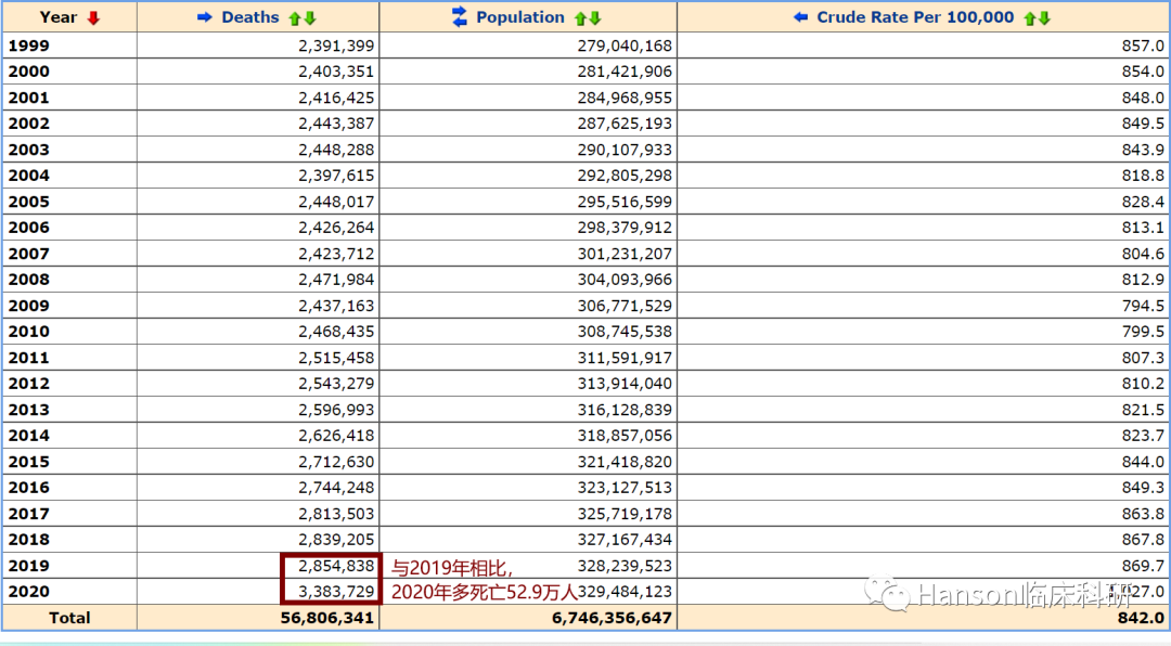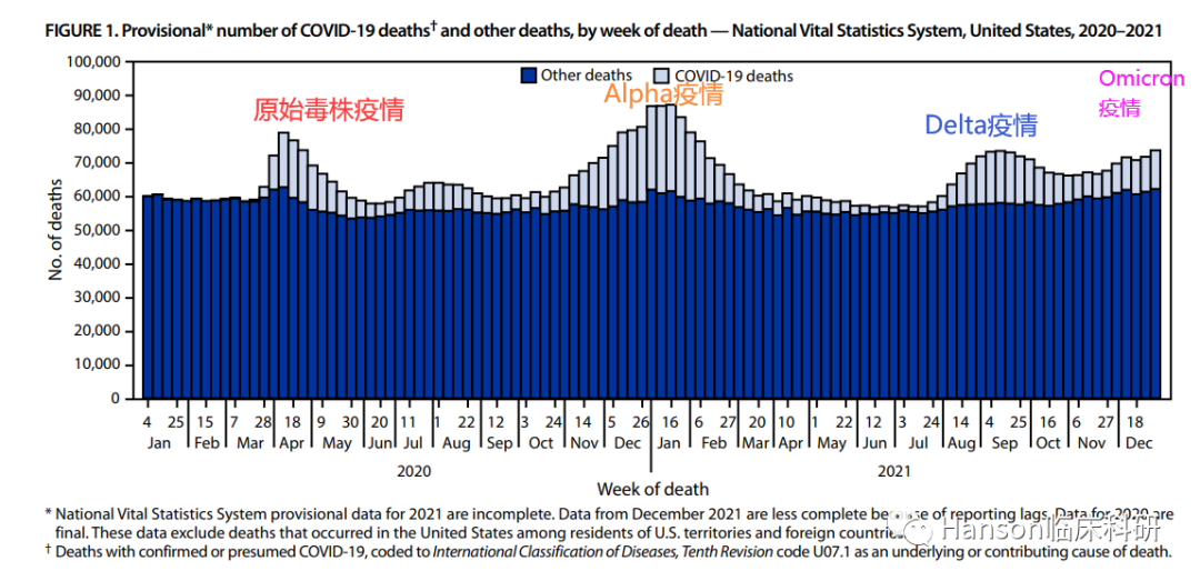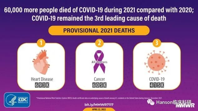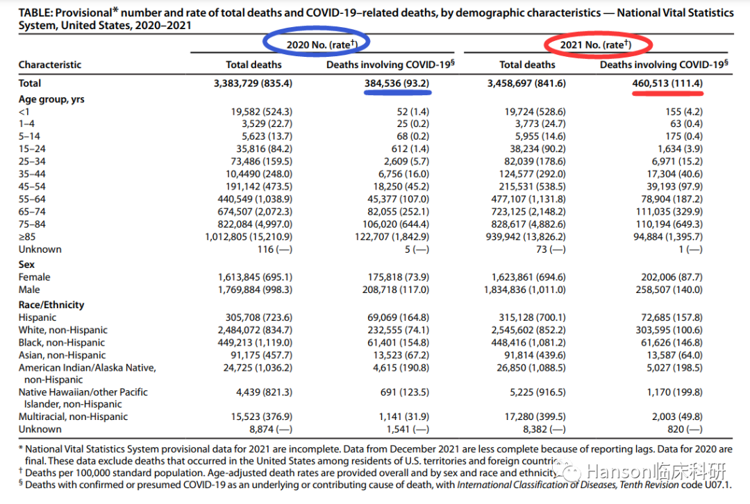 2022年4月初,在华山医院工作的赵兄弟发来一个视频,问我“是否认同”。 这个视频解读了美国CDC公布的死亡人数变化,显示2020年美国的死亡人数骤增;播主很遗憾没有2021年的数据。 我当时的回答是: 然后我找到美国CDC公布的额外死亡数据,从2020年2月COVID-19发生算起,到2022年2月1日,美国额外死亡人数已经超过了110万人【1】。 这之后我就一直很注意,同样很想知道2021年已经开始接种新冠疫苗的美国,与未接种疫苗的2020年在新冠死亡方面有哪些差别。 2022年4月29日,美国疾控中心(CDC)周报终于报告了2021年美国新冠病死率【2】。 1,2021年美国COVID-19死亡人数比2020年增加20%! 根据美国CDC国家健康统计中心(NCHS)的数据,2021年美国共死亡3,458,697人。 如果与2020年比较,并在进行年龄矫正死亡率(AADR)之后,美国AADR由2020年的835.4/10万人口增加到了2021年的841.6/10万人口,增加了0.7%。 2021年COVID-19作为美国根本死因(underlying cause)或者促死原因(contributing cause)的死亡人数为460,513例,比2020年的384,536例竟然还多了75,977例(增加20%)。 其中COVID-19作为根本死因的病例415,399例,占90%,COVID-19作为促死原因的病例为45,114例,占10%。 (表1. 美国按照年龄、性别和种族区分的死亡率) 2,2021年美国COVID-19死亡病例中,25-54岁的中青年增幅最高。 按理说,2020年12月开始接种疫苗会建立起预防病死的保护,且2021年的美国人已经是新冠幸存者了;怎么还会有更多的病死呢? 我们仔细看表1,可以看到2021年85岁及以上老年人的死亡率确实降低,但是其他年龄段都有增高,并且以25-54岁年龄段的死亡增幅最高。 按照种族看,2021年美国白人死于新冠的人数增高最明显。 如果回顾之前的数据,就可以理解上述两个人群增长相对更高的原因, 1),在美国最初死于新冠感染的12万人中,养老院的老人占了40%以上。 2),最初的COVID-19感染者中,拉美裔占了特别高的比例,比如我所在的郡,拉美裔感染者占到了61.7%。 也就是说,更虚弱的老年人在2020年就病死了;很多拉美裔也在2020年就感染或是病死了。 3,2021年美国COVID-19病死人数更多,主要是由于新冠病毒的突变。 尽管2020年12月,美国开始由医务人员、养老院老年人开始,依次按照年龄段接种疫苗,但新冠病毒新的突变株仍带来更大的伤害。 这些突变株的共同特点是传染性更强,也由此在病毒株的竞争中胜出,却也给人类带来更大的伤害。 4,新冠是2021年美国人第三位的根本死因,但其他疾病亦不容忽视。 2021年导至美国人死亡最多的疾病依次为:心脏病、癌症、COVID-19、意外伤害、中风、慢性下呼吸道疾病和老年性痴呆等。 这组数据与2020年的数据基本一致。 这其中,心梗和脑梗都是需要通过绿色通道紧急处理的疾病。及时溶栓,患者可能就完全恢复正常,未及时治疗则可能就是非死即残的永久伤害。 小结: (2021年美国死亡中根本死因的前三位。图源:美国CDC) 美国CDC的这份报告解读了我很多疑问,显示: 1,2021年美国COVID-19死亡人数比2020年增加20%,且以25-54岁的中青年增幅最高。 2,2021年美国COVID-19病死人数更多,主要是由于新冠病毒的突变; 3,COVID-19是2021年美国第三位的根本死因,其他疾病亦不容忽视。 参考资料: 【1】 https://www.cdc.gov/nchs/nvss/vsrr/covid19/excess_deaths.htm 【2】 https://www.cdc.gov/mmwr/volumes/71/wr/mm7117e1.htm?s_cid=mm7117e1_w |