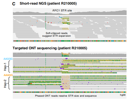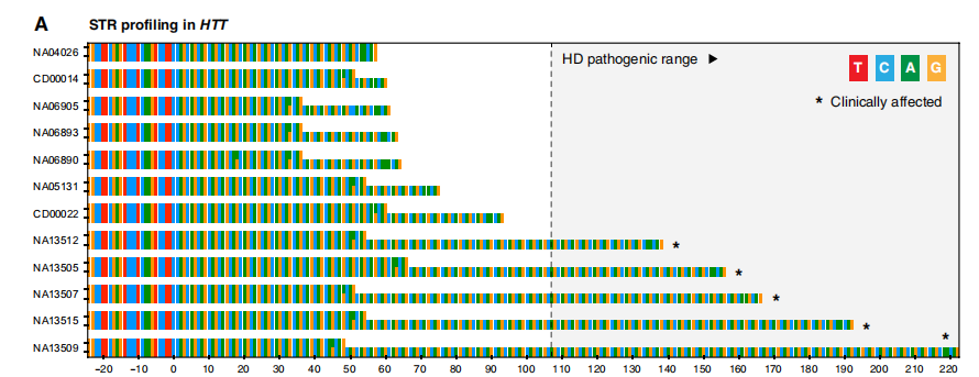 短串联重复序列(STR)是一种短DNA序列基序,通常为2到6个碱基对(bp),在基因组中的给定位置连续重复。STR约占人类基因组序列的7%,具有高度多态性,通常在无关个体之间长度不同。异常长或“扩展”的STR等位基因是人类群体中一类重要的致病性变体。迄今为止,已有40多个基因的STR扩展被证明会导至遗传性疾病,其中大多数表现为原发性神经或神经肌肉表现。这些疾病包括亨廷顿病(HD;HTT)、脆性X综合征(FXS;FMR1)、遗传性小脑共济失调(RFC1、FXN和其他)、强直性肌营养不良(DMPK和CNBP)、肌阵挛性癫痫(CSTB、SAMD12、STARD7和其他),以及C9orf72相关的额颞叶痴呆和肌萎缩侧索硬化(ALS)。据估计,这>40个STR相关的神经遗传疾病中,每10万人中约有1至10人感染其中一种,它们的总体患病率很高。此外,与STR扩展相关的疾病列表仍在增加,许多致病性STR基因最近已被描述。 鉴于(i)STR扩展障碍的广泛多样性和总体高患病率,(ii)涉及的基因数量众多,(iii)新基因的频繁识别,(iv)致病性STR扩展等位基因的大小和序列构象多样性,以及(v)我们对其基本生物学的理解存在许多差距,人们越来越需要改进的STR分子表征方法。已建立的分子技术,例如,Southern杂交和重复引物聚合酶链反应(RP-PCR),相对缓慢、劳动密集且不精确,需要对每种不同的STR分别使用特定的引物/探针进行检测。当多个不同的STR扩展可以表现为相似的表型(基因座异质性)时,这成为一个问题,并且是对新识别的STR基因进行检测的主要障碍。下一代测序(NGS)对STR扩展的分析有一定的实用价值。然而,许多致病性STR扩展的大尺寸、低序列复杂度和高GC含量使得它们难以通过短读NGS平台(例如Illumina)进行分析。 Oxford Nanopore Technologies(ONT)和太平洋生物科学公司(Pacific Biosciences)的长读测序技术可用于对大型复杂STR扩展进行基因分型。同时分析重复位点的DNA甲基化是这些技术的另一个优势。然而,在这两种平台上进行全基因组分析的成本仍然高得令人望而却步。最近开发了一种基于cas9的STR基因座定向富集和长读测序方法。然而,这与现有的分子技术有着相同的局限性,因为每个不同的STR都需要一组独特的cas9导向RNA,需要仔细设计和实验优化。定向长读测序的另一种方法是ONT的“ReadUntil”功能,通过该功能,可以对ONT测序设备进行编程,以便在测序实验期间识别和接受/拒绝特定的DNA序列片段。目标选择是完全灵活的,除了标准的库准备外,不需要额外的实验室过程。 近日,来自澳大利亚和以色列的研究团队在SCIENCE ADVANCES杂志上发表了一篇题为“Comprehensive genetic diagnosis of tandem repeat expansion disorders with programmable targeted nanopore sequencing”的文章。在文章中,研究团队使用一个由37个与神经和神经肌肉疾病相关的STR基因座组成的定制panel,使用可编程的靶向长读测序和Oxford Nanopore的ReadUntil功能,在一次分析中对所有已知的神经源性STR进行平行基因分型。这种方法可以正确诊断一个小队列(n=37)中的所有个体,包括患有各种神经遗传疾病(n=25)的患者。有针对性的长读测序解决了大而复杂的STR扩展,这些扩展会混淆已建立的分子检测和短读测序,并识别非标准STR基序构象和内部序列中断。研究团队还观察到已知和未知致病基因的STR等位基因多样性,这表明长阅读测序将重新定义重复性疾病的遗传格局。研究证实了可编程ONT测序在STR扩展障碍基因诊断中的分析有效性,并展示了这种方法的诸多优势。 图片来源:Science Advances 主要内容 致病性STR的可编程靶向nanopore测序 ONT的ReadUntil功能有可能对所有已知致病性STR基因座进行简单、经济高效的测序,但这是一项基本上未经测试的技术。为了评估ReadUntil在STR分析中的应用,研究团队设计了一个定制panel,包含所有已知的与原发性神经和神经肌肉疾病相关的致病性STR扩展基因。对于每个基因,整个位点,包括两个方向的50kb侧翼序列都被包含。该panel包括一系列额外的临床信息位点,总共覆盖了约50.5 Mb,相当于人类参考基因组的约1.6%。 研究团队使用开源软件包Readfish对37个基因组DNA样本进行了靶向测序。结果显示,与目标读取(N50=12.5 kb)相比,非目标读取(N50=2.5 kb)的读取长度持续减少,这表明成功地拒绝了目标区域之外的片段。这导至目标区域内测序深度的中位数增加了4.6倍,在整个队列中产生了约9到40倍的目标覆盖率。 使用ONT ReadUntil对致病性STR位点进行定向测序。 图片来源:Science Advances 可编程靶向STR测序的有效性和实用性 为了确定靶向纳米孔测序分析的有效性和实用性,研究团队分析了一系列患者来源的参考DNA样本和神经遗传疾病患者(n=25)的DNA样本,包括HD(n=5);FXS(n=2);小脑共济失调、神经病变和前庭无反射综合征(CANVAS;n=6);Kennedy脊髓和延髓肌萎缩(SBMA;n=1);强直性肌营养不良1例(DM1;n=5);神经元核内包涵体病(NIID;n=1);弗里德赖希共济失调(FRDA;n=2);ALS(n=1);脊髓小脑共济失调1型(SCA1;n=1);眼咽肌营养不良症(OPMD;n=1),以及已知的突变前携带者(n=6)和未受影响的个体(n=6)。样本已在经认证的遗传病理学实验室或使用标准方法进行独立分子检测。 1. 亨廷顿病 HD是一种常染色体显性遗传神经退行性疾病,由HTT基因中≥36个“CAG”基序STR扩展引起,在≥40拷贝时完全外显。STR扩展大小与疾病严重程度相关,扩展等位基因内缺乏特征性的“CAA”中断基序也是如此。因此,HD的基因诊断需要准确的等位基因特异性STR测定和内部序列测