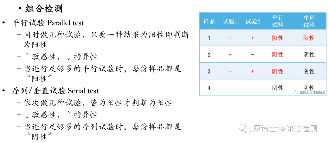 假阴性率(漏诊率β)=1-诊断敏感性,因而诊断敏感性越高,假阴性率越低;假阳性率(误诊率α)=1-诊断特异性,因而诊断特异性越高,假阳性率越低;我们可能经常看到某种方法为金标准方法,比如核酸检测经常被用于胶体金试剂评价的金标准方法,金标准方法只是相对某种方法更准确的方法,金标准方法仍然无法达到100%,也仍然会产生假阳性或假阴性。阳性预测值PPV:在检测的阳性结果中真正为患病群体的比例。阴性预测值NPV:在检测的阴性结果中真正为健康群体的比例。由于检测方法的敏感性和特异性是一个诊断试验的内在属性,是不会随着流行率的变化而改变。当流行率增加时,阳性预测值增加而阴性预测值减小,假阳性降低,假阴性增加;当流行率减小时,阳性预测值减小而阴性预测值增加,假阴性降低,假阳性增加.例如在10万人口中,COVID-19流行率为0.1、0.5、1、5、10、20、30%,敏感性和特异性分别为90%/99%时的阳性预测值(PPV)和阴性预测值(NPV)以及检测结果为真阳性(TP)、假阳性(FP)、真阴性(TN)和假阴性(FN)的数量。进行多重试验时,至少有一种试验结果是阳性就认为该个体为阳性.在疾病流行率一定的情况下,采用平行策略会增加诊断试验的敏感性,从而使得阴性预测值升高;使得特异性和阳性预测值降低.当采用这种策略时,可能会使得健康个体被误诊即假阳性。进行多重试验时,必须得所有试验结果为阳性才能认为个体为阳性.在疾病流行率一定的情况下,采用垂直策略会增加诊断试验的特异性,并使得阳性预测值升高;使得敏感性和阴性预测值降低.当采用这种策略时,可能会使得发病个体被漏检即假阴性。假设一个城市的人口为2500万,真实流行率为1%,则该城市有25万感染者。如果按照抗原检测平均敏感性为70%,荧光定量PCR核酸检测的敏感性为90%。策略1:连续进行核酸检测,需进行6轮检测,漏检人数小于1策略2:1次核酸2次抗原检测交替进行时,先做核酸的情况下需进行3轮核酸和5轮抗原共8轮检测,漏检人数小于1。采用“检测-隔离”策略,通过将检测阳性群体进行隔离减少感染人数降低R0,通过两种模型计算2种LOD方法,不同检测间隔对R0的降低。每天检测可将R0降至0,每3天检测可将R0降低80-90%,每周检测则R0降低约50%。因此检测间隔越长,“假阴性”的比例越高,这里的假阴性并非方法学引起,而是病毒继续在人群中传播引起的多次检测结果不一致的“假阴性”。 “检测-隔离”策略的基本原理是降低R0,以下公式中主要的影响因素有:ftest(se):检测隔离的感染人数的比例(包含自我隔离)如果大家都不服从隔离政策φ=0或者检测方法无效,ftest(se) = f0,则R=R0,“检测-隔离”策略失败;如果参与隔离策略的人群比例为100%,则φ=1,R与以下公式有关,如果感染者都能服从检测并进行隔离则ftest(se)=1,R=0,传染可被完全阻断; 因此“检测-隔离”策略成功的关键是大部分人参与检测,阳性隔离,如果有感染者不进行检测在人群中继续传播病毒,则也会引起“假阴性”,这里的假阴性并非方法学引起,而是病毒继续在人群中传播导至多次检测结果不一致的“假阴性”。 每个检测人都在孜孜不倦地追求检测结果的真阳性和真阴性。但是对于检测了解的越多越会感到沮丧,因为即使你做到了完美,也避免不了假阳性和假阴性。有些人笑称检测是一门玄学,我坚定地认为检测是一门实实在在的科学!虽然目前仍不够完美的,仍然使我们的生活更加美好! |