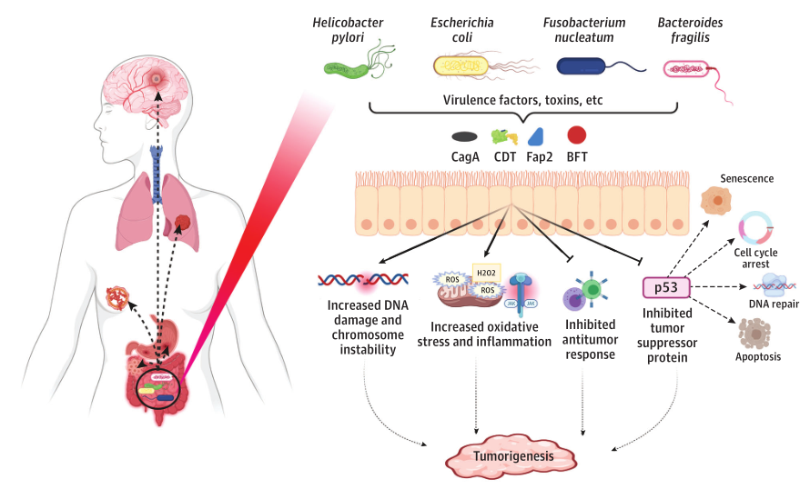 遇事不决,量子力学;机制不明,肠道菌群!除了DNA,感觉对人体产生最大影响的就数肠道菌群了。万能的肠道菌群,无论什么研究领域,哪儿那儿都有它的影子。这篇文章大伙儿还是看一看,说不定什么时候,你就会发现肠道微生物群检测成了癌症治疗的常规辅助检测方法。 近日,来自哈佛大学的研究团队在高分杂志JAMA oncology上发表了一篇题为“The Potential of the Gut Microbiome to Reshape the Cancer Therapy Paradigm”的文章,在文章中,作者从临床角度全面综述了胃肠道微生物组与免疫治疗、化疗、放疗、癌症手术等治疗反应的关联性,同时作者认为应该探索对一些最具挑战性的肿瘤进行治疗时,结合微生物制剂进行可能的综合治疗策略。 图片来源:JAMA Oncology 背景 人类微生物群包括细菌、古细菌、真菌和病毒等在个体中表现出巨大的种群变异。长期以来,人们一直认为,肠道微生物群中的微生物只对食物的消化和营养的获取起作用;然而,随着新的分子技术(即16S rRNA测序、DNA测序和宏基因组学)的出现以及无菌小鼠的作用,肠道微生物在维持系统稳态的作用被揭开。首先,微生物通过产生或转化神经递质、短链脂肪酸(SCFA)、氨基酸和次级胆汁酸,来维持循环营养素和代谢物水平的平衡。此外,微生物对免疫系统的培养和发育具有重要的控制作用。例如,某些常见的细菌种类可能会诱导某种免疫细胞极化,并产生炎症性或抗炎性作用,有时甚至会最终导至免疫抑制。因此,越来越多的人需要将微生物群的重要性与肿瘤发展、诊断和治疗联系起来。 肠道微生物病与癌症的发展 当肠道中的细菌微妙的平衡被破坏时,导至多样性较小、不稳定,而且往往是更具致病性的微生物群,通过负面影响宿主代谢或宿主免疫反应和功能,导至各种疾病病理学。胃肠道微生物生态失调与肿瘤的发生密切相关。 幽门螺杆菌感染和随后诱发的胃炎的发展密切相关,被认为是癌症的前兆。在胃上皮细胞中,幽门螺杆菌诱导p53(一种抑癌蛋白)的降解,从而导至胃癌的形成;此外,幽门螺杆菌来源的CagA蛋白与上皮E-cadherin相互作用,促进细胞增殖,增加致癌细胞转化的可能性。由细菌病原体产生的毒素,如大肠杆菌素和细胞致死性膨胀毒素,具有导至肿瘤形成和进展的DNase酶活性。此外,致病细菌如福氏志贺氏菌和拟杆菌,分别通过宿主DNA损伤反应干扰或通过精胺氧化酶活性产生氧化应激来积累DNA损伤。此外,某些物种甚至可以通过抑制宿主抗肿瘤免疫反应来帮助癌症形成。 肠道细菌也与其他癌症有关。已知伤寒沙门氏菌和螺杆菌与胆管癌的发生有关,并认为肠道微生物群会影响肝、乳腺癌的发生。肝脏通过门静脉系统暴露于肠道细菌、代谢物和副产物的传播中。在乳腺癌中,类固醇代谢可能与肠道细菌有关,导至植物雌激素和雌激素的变化,这些激素可能在抗癌中发挥作用。脑肿瘤是另一个被推测受微生物群影响的新兴领域,因为微生物群——肠道——脑轴的影响越来越大。 胃肠道微生物生态失调与肿瘤的发生密切相关 图片来源:JAMA Oncology 肠道微生物群和免疫治疗 使用免疫检查点阻断(ICB)的免疫疗法,在靶向PD-1和CTLA-4方面取得了显著进展。尽管这些新的ICB策略很有前途,但它们在个体间有很大的差异,并且在肿瘤类型之间治疗的效果并不一致。因此,迫切需要一种预测性的生物标记物,以应对并更好地理解为什么存在这种异质性,从而提高治疗效果和相应人群。 几项研究已经注意到ICB治疗的应答者和无应答者在微生物多样性和组成方面的重要差异,这表明包括临床应答在内的变异可能归因于肠道微生物群。且实验证明了微生物调节剂影响ICB的疗效。已知某些活菌或益生菌在癌症修复中发挥关键作用,包括影响抗炎细胞因子水平、检测和降解潜在致癌物、激活吞噬细胞清除早期癌细胞,以及产生影响细胞死亡和增殖的SCFA。 通过抗生素药物和噬菌体靶向肠道人群的免疫治疗也需要额外关注。例如,万古霉素通过降低有害的革兰氏阳性菌可以提高CTLA-4阻断疗法的疗效,同时不影响革兰阴性菌。然而,由于对相似类型的菌株没有精确的靶向性,抗生素药物可能会通过减少细菌多样性而造成不良影响。例如,一项研究发现,联合应用抗肿瘤药物和免疫治疗可缩短癌症患者的无进展生存期和总体生存期。因此,作为抗生素的替代,噬菌体可以专门针对有害的致病细菌。当与检查点抑制剂或血液疗法相结合时,将具核梭杆菌结合的M13噬菌体与银纳米颗粒相结合,可显著减少骨髓源性抑制细胞,从而显著延长小鼠模型的总体存活时间。 总的来说,利用微生物组增强免疫疗法是有希望的。然而,尽管抗肿瘤免疫反应与健康和多样的菌群呈正相关,但在识别临床队列中重叠的细菌种类方面存在显著差异。因此,需要寻找产生的共同的功能产物和代谢产物。最近的一项研究提供了支持这一点的证据,显示了多种肠道细菌产生的SCFA可促进抗原激活的CD8+T细胞的记忆潜能。考虑到所有这些因素,可能需要重新设计免疫疗法,将微生物调节治疗元素(例如益生菌或微生物衍生代谢物的补充)合并为一种标准化方法,以最小化异质性和增强免疫效果。 微生物调节剂影响癌症治疗的疗效 图片来源:JAMA Oncology 肠道菌群与化疗 微生物群也参与介导化疗药物的治疗反应。例如,环磷酰胺是一种用于化疗的免疫刺激烷基化剂,已被注意到由于缺