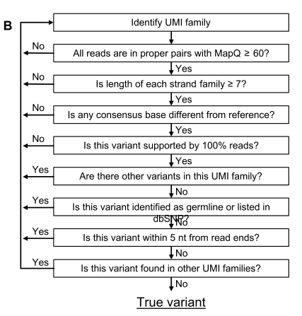 多细胞生物体细胞基因组的突变是DNA修复或复制过程中错误的必然结果。体细胞突变导至癌症,并与其他病理学有关。过去,人们曾试图开发定量分析细胞和组织中各种类型突变的分析方法。鉴于DNA测序的显著进展,人们会认为在人类或动物细胞和组织中,体细胞突变应该很容易定量检测。在很短的时间内,关于人类肿瘤体细胞突变的大量信息已经变得可用。然而,肿瘤是克隆谱系,在肿瘤的单个细胞之间共享许多突变。然而,正常组织中的突变对于每个细胞来说都是唯一的,通过测序来检测它们仍然是一个挑战,因为体细胞突变发生的丰度很低,并且通过测序时读取传播,与测序错误无法区分。克服这个问题的一种方法是使用基于单细胞的方法。然而,尽管单细胞方法是目前唯一一种允许对体细胞突变负荷进行全基因组全面评估的方法,但这种方法耗费资源和时间,价格昂贵,限制了其广泛应用。另一种方法是双链测序(duplex Seq),它基于互补DNA链的比较分析,可以准确定量地识别大量DNA中的超罕见体细胞单核苷酸变体(SNV)。虽然在技术上比单细胞测序要求更低,但Duplex-Seq抑制错误的能力仅限于一条链上错误概率的平方。 近日,来自于美国、俄罗斯、中国的研究团队在杂志SCIENCE ADVANCES上发表了一篇题为“Single-molecule, quantitative detection of low-abundance somatic mutations by high-throughput sequencing”的文章,在这篇文章中,研究团队介绍了单分子突变测序(SMM-seq),这项技术可以准确、经济高效地评估从正常细胞和组织提取的大量DNA中的体细胞SNV。 图片来源:Science Advances 主要内容 SMM-seq建库 SMM seq的关键特性是两步建库方法。首先,基于滚环扩增法(RCA)用于产生单链DNA分子,由每个特定DNA片段的多个相同DNA链的联合拷贝组成。使用具有强链置换活性的人工耐热聚合酶进行扩增。这允许进行多次变性退火延伸,以确保在称为pulse-RCA的反应中进行有效且无偏倚的放大。因为所有这些拷贝都是原始DNA片段的独立复制品,所以每个拷贝的潜在扩增错误都是唯一的,不会进一步传播。相反链的拷贝以端到端的方向排列,并在该过程的第二步中被用作聚合酶链反应(PCR)启动位点的公共间隔子分离,此时,将共聚合拷贝单独扩增并转化为测序文库。因此,由此产生的测序文库由在滚环(RC)扩增子中组装的原始DNA片段的多个独立拷贝的PCR副本组成。 SMM-seq工作流程概述 图片来源:Science Advances SMM seq数据分析和确定真突变的算法概述 来自同一片段的测序读取基于在文库制备过程中作为发夹状adapter的一部分引入的唯一分子标识符(UMI)进行识别。然后,由来自原始片段的两条链的读码组成的UMI家族被用来识别每个片段的一致序列。参考基因组上相应位置不同位点信息与该特定DNA样本的单核苷酸多态性(SNP)列表以及SNP数据库(dbSNP)进行比较。这允许筛选出种系变体,并识别潜在的de novo体细胞突变。通过分析与SMM-seq并行进行的同一DNA样本的常规测序数据,获得了种系SNP列表。最终的潜在体细胞SNV列表被进一步过滤以排除低置信度候选,然后保存以供进一步分析。 SMM-seq检测到的每个变异都属于以下类别之一:真阳性(TP)或假阳性(FP)。为了确定最佳分析参数,研究团队对每步的分析参数进行了优化,最后确定了如下图所示的算法可以最大程度上区分真突变和扩增引入的测序错误。 SMM-seq确定真突变的算法概述 图片来源:Science Advances 用SMM-seq检测ENS诱发的SNV 作为原理证明,研究团队首先对从体外接受两种不同剂量的N-乙基-N-亚硝基脲(ENS)处理的正常人IMR90成纤维细胞中提取的DNA进行SMM-seq分析,ENS是一种有效的点诱变剂。在这里,研究团队使用亚致死剂量的ENU,不会在IMR90细胞上造成任何明显的细胞死亡。对SMM-seq数据的分析显示,每个样本基因组平均约有2亿个位置符合SNV识别条件,即约占基因组7%。从IMR90 DNA中制备常规测序文库,测序,并与SMM-seq并行分析,以获得IMR90特异性种系SNP列表。结果显示,SMM-seq分析允许在所有测试条件下检测ENU的诱变效应。ENU的最低剂量(25 ug/ml)使IMR90细胞的突变频率从0.21±0.02增加到0.36±0.04 SNV/1 Mbp(P=0.005),而ENU在50 ug/ml导至突变频率增加两倍以上(0.54±0.03 SNV/1 Mbp;P=9.7×10−5). 研究团队还测试了对照组、未处理细胞和接受ENU处理的细胞中体细胞SNV的突变谱。结果显示ENU处理后突变谱发生明显变化,TA/AT和TA/CG突变的相对表达[特定于ENU]>比未处理对照细胞大2倍。因此,SMMseq能够检测由低剂量诱变剂诱导的体细胞SNV。 诱导体细胞SNV的定量检测 图片来源:Science Advances 用SMM-seq检测与衰老相关的SNV 研究团队测试了SMM-seq是否能够检测衰老过程中积累的人体组织中的生理突变负担。研究团队利用了最近发表的关于人类肝脏中年龄相关突变负荷的研究,该研究采用基于金标准单细胞的方法进行,并使用SMM-seq分析法重新分析了相同的样本。研究团队使用同一研究中每个参与者的大量DNA的全基因组序列来减去种系SNPs。SMM-seq文库是从三名年轻人(5个月、16个月和18岁)和三名老年人(56、61和77岁)的肝组织提取的DNA样本中制备的。本实验中对SMM-seq数据的分析显示,每个样本基因组平均约有7.7亿个位置符合识别SNV条件,相当于样本基因组的约26%。SMM-seq证实了通过单细胞方法观察到的体细胞突变频率的年龄相关升高。SMM-seq检测的突变频率在年轻组和老年组中分别为0.34±0.09和0.96±0.16体细胞SNV/1 Mbp(P=0.00