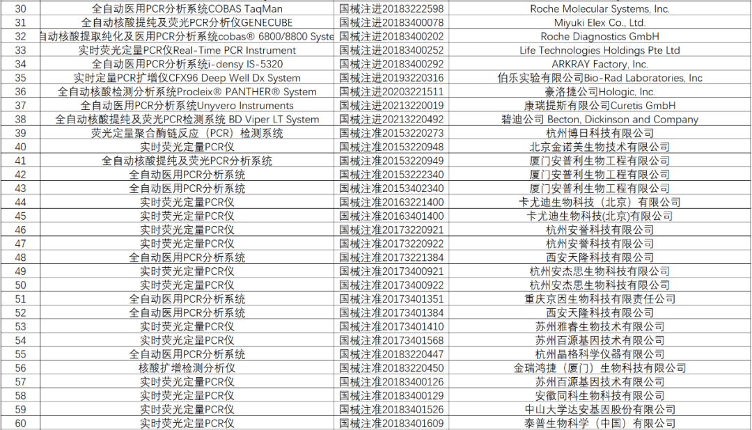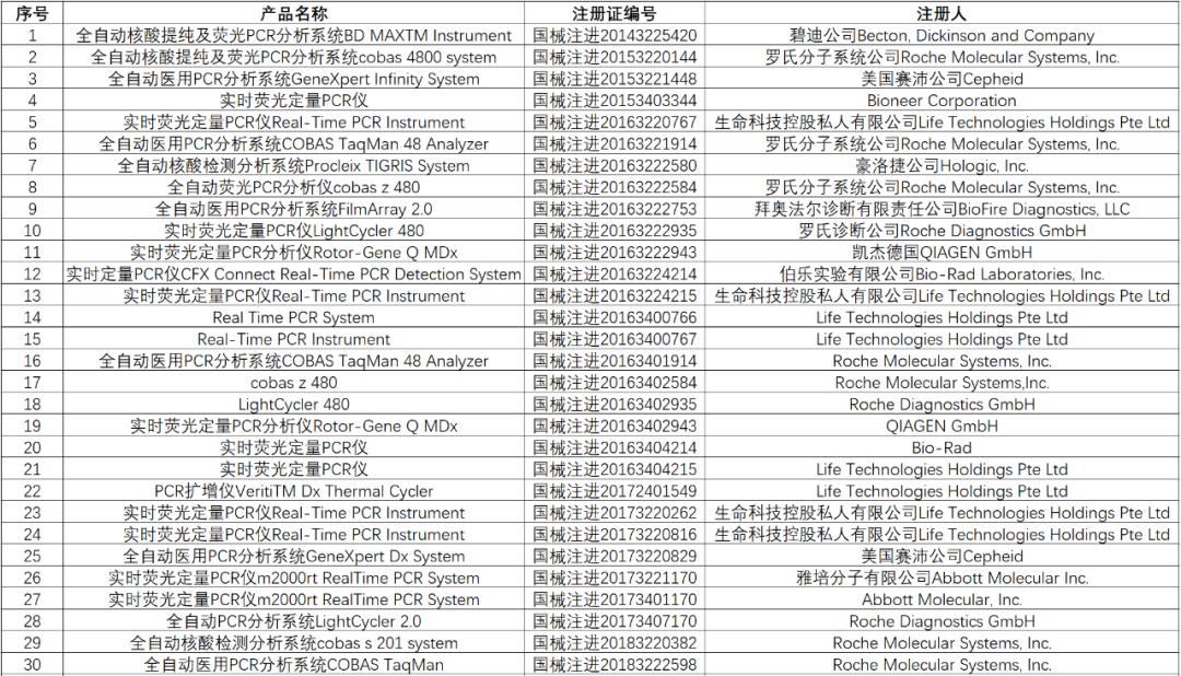 PCR检测方法根据其原理,主要分成两部分:1. 样本核酸提取/纯化;2. 扩增与分析。有的PCR仪器1和2都可以进行(暂定义为全自动PCR仪器,一体化检测),有的PCR仪器只能进行2(暂定义为非全自动PCR仪器)。截止到目前,全自动PCR仪器有15款获证,已获证的PCR仪器现状如图12,表4。