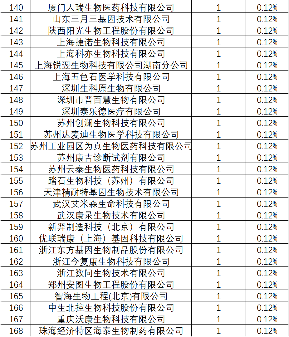 PCR技术为经典核酸扩增检测技术之一,NMPA共批准了848款PCR试剂盒,境内产品占主要,具体数据见图5,涉及168家公司,获证数靠前的5家公司为:达安基因(57款产品)、上海之江(35款产品)、泰普生物(25款产品)、艾康生物(24款产品)和百泰基因(23款产品),具体数据见表1。