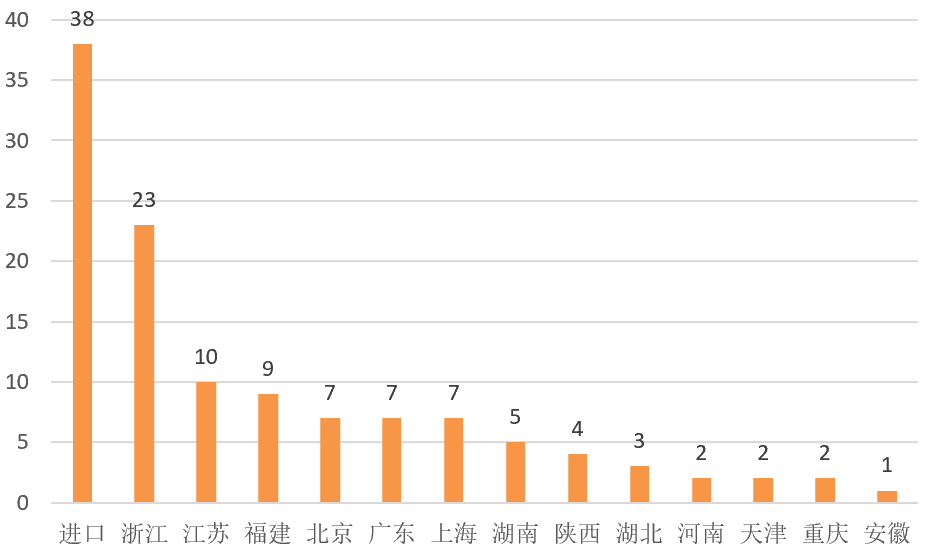 获证公司主要集中在经济发达省份,其中,浙江、江苏、福建、北京、广东是获批产品排前五名的省份(该处进口不排名),具体数据看图14。