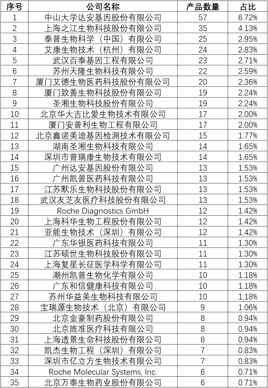 NMPA共批准了31款试剂盒,境内产品占主要,具体数据见图15,涉及17家公司,具体数据见表6。这31款产品中有30款是病原微生物检测相关试剂,这也符合其技术特点。