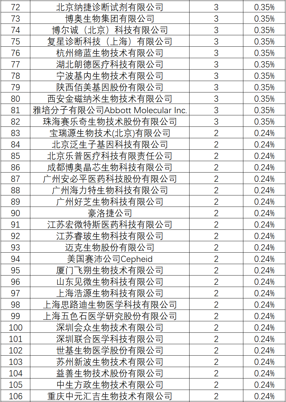 不同的公司根据自身情况有着不同的商业布局,有的只设计开发PCR试剂,有的公司只设计开发PCR仪器(开放性平台),而有的公司则是同时布局PCR试剂和PCR仪器,目前共有22家公司同时布局PCR试剂和PCR仪器,具体数据见表5。近年来随着IVD行业的快速发展,其他IVD细分领域(非核酸扩增领域)两手布局(试剂+仪器)的公司也在变多,后续在其他细分领域的分析报告中会阐述。