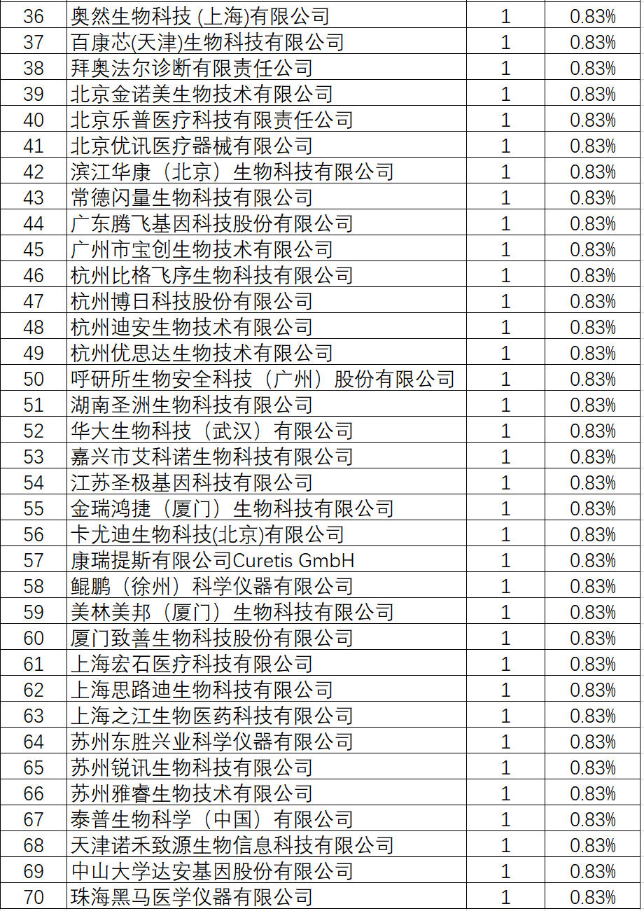 NMPA共批准了120款PCR仪器,进口产品占主要,具体数据见图11和表2,涉及70家公司,获证数靠前的5家公司为:Life Technologies Holdings Pte Ltd(9款产品)、Roche Molecular Systems,Inc. (7款产品)、Roche Diagnostics GmbH(4款产品)、杭州安誉(4款产品)和西安天隆(4款产品),具体数据见表3。