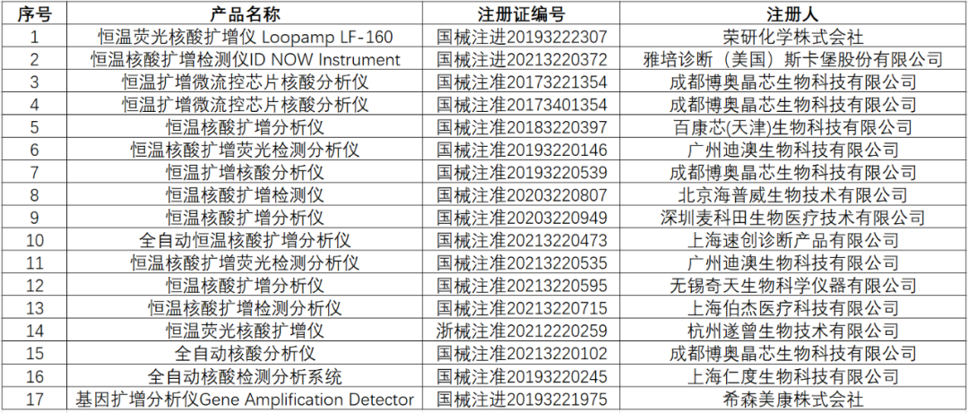 NMPA共批准了17款仪器,境内产品占主要,具体数据见图16,涉及13家公司,具体数据见表7。恒温扩增仪器中出现了核酸提取-扩增分析的一体式仪器。