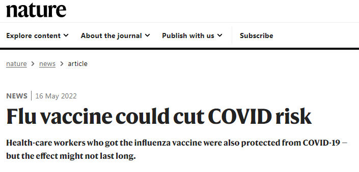 [1]https://www.nature.com/articles/d41586-022-01315-9[2]Elias Tayar, Sami Abdeen, Muna Abed Alah, et al. Effectiveness of influenza vaccination against SARS-CoV-2 infection among healthcare workers in Qatar. medRxiv 2022.05.09.22274802; doi: https://doi.org/10.1101/2022.05.09.22274802.[3]Bao Mei-Mei, Yang Kai, Yuan Bing. Influenza virus and coronavirus: Cellular binding and internalization. Acta Phys. Sin., 2020, 69(20): 208701. doi: 10.7498/aps.69.20201161 本文系生物探索原创,欢迎个人转发分享。其他任何媒体、网站如需转载,须在正文前注明来源生物探索。
